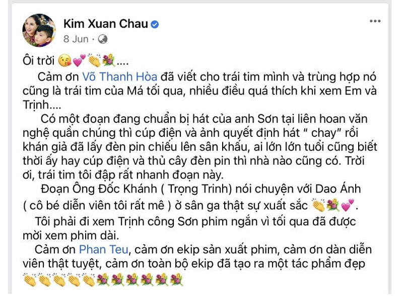 NSƯT Kim Xuân chia sẻ về một phân cảnh trong phim: “Có một đoạn đang chuẩn bị hát của anh Sơn tại liên hoan văn nghệ quần chúng thì cúp điện và ảnh quyết định hát “chay” rồi khán giả đã lấy đèn pin chiếu lên sân khấu, ai lớn lớn tuổi cũng biết thời ấy hay cúp điện và thủ cây đèn pin thì nhà nào cũng có. Trời ơi, trái tim tôi đập rất nhanh đoạn này”.