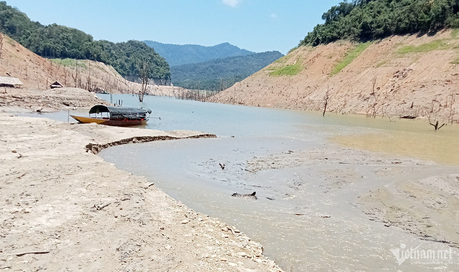Đến nay, hạn hán kéo dài, khiến khiến lòng hồ Bản Vẽ bị trơ đáy, mọi người phải lội bùn, đi bộ hàng trăm mét mới đến được bến thuyền.