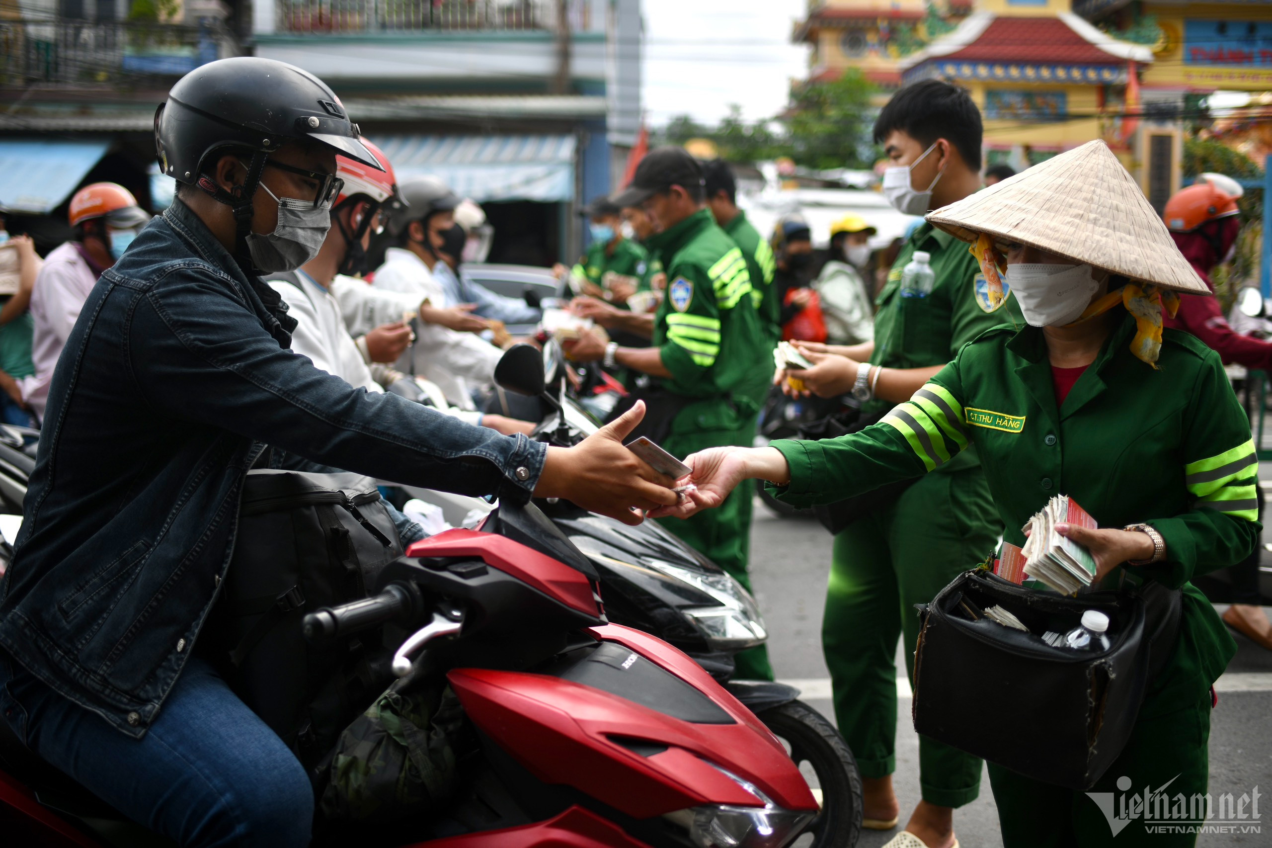 Các nhân viên tại bến phà chia thành nhiều nhóm bán vé cho khách nhằm giãn dòng xe, hạn chế tập trung cùng lúc đến đầu phà về TP.HCM.