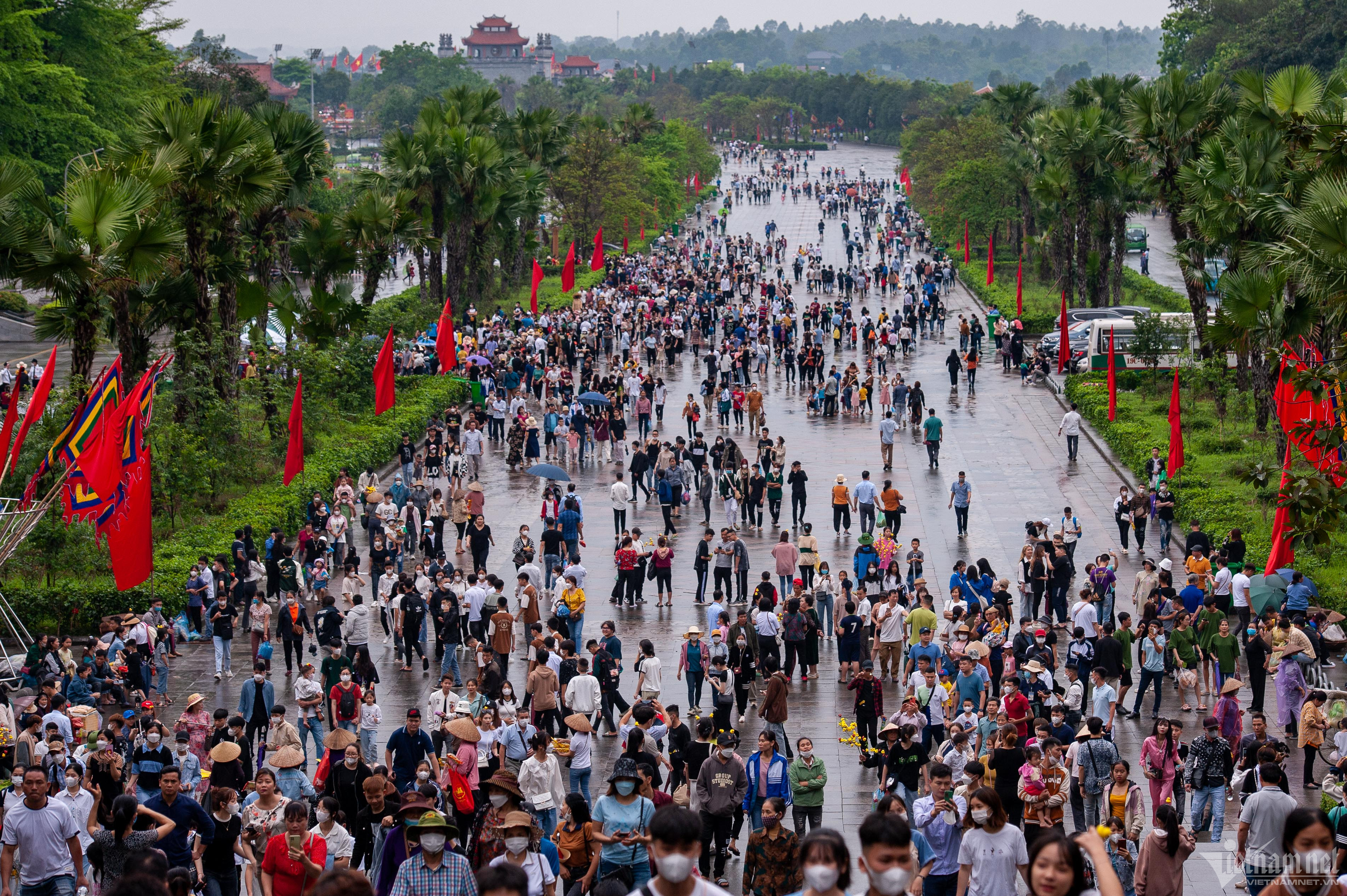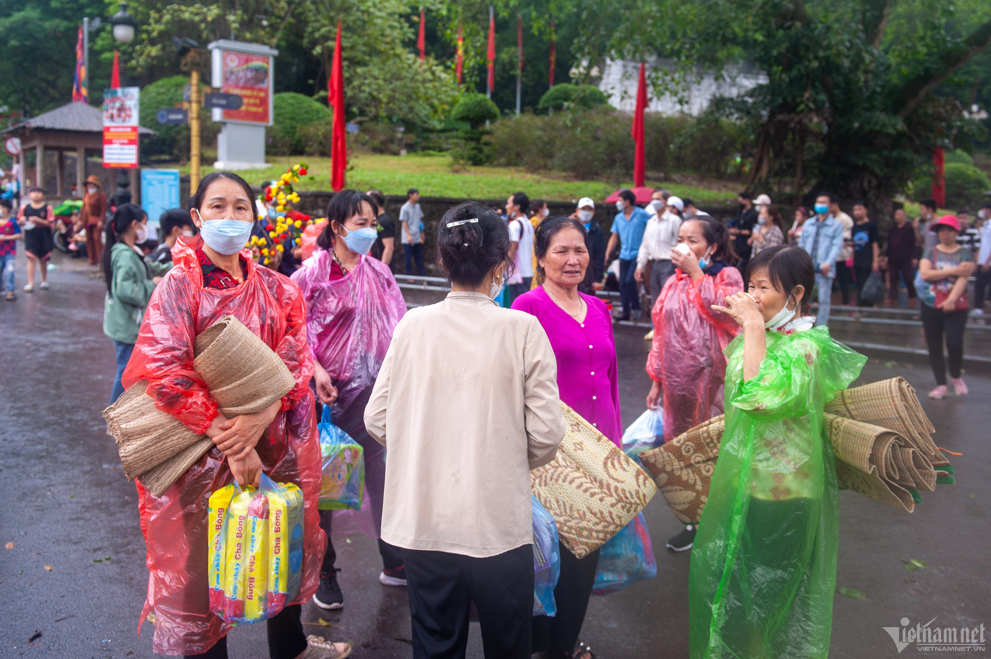 Do ngày lễ Giỗ Tổ rơi vào thứ bảy và trùng lịch nghỉ lễ 30/4 -1/5, mưa lớn nhiều người dân, du khách vẫn từ khắp nơi đổ về Đền Hùng lễ bái từ sớm.