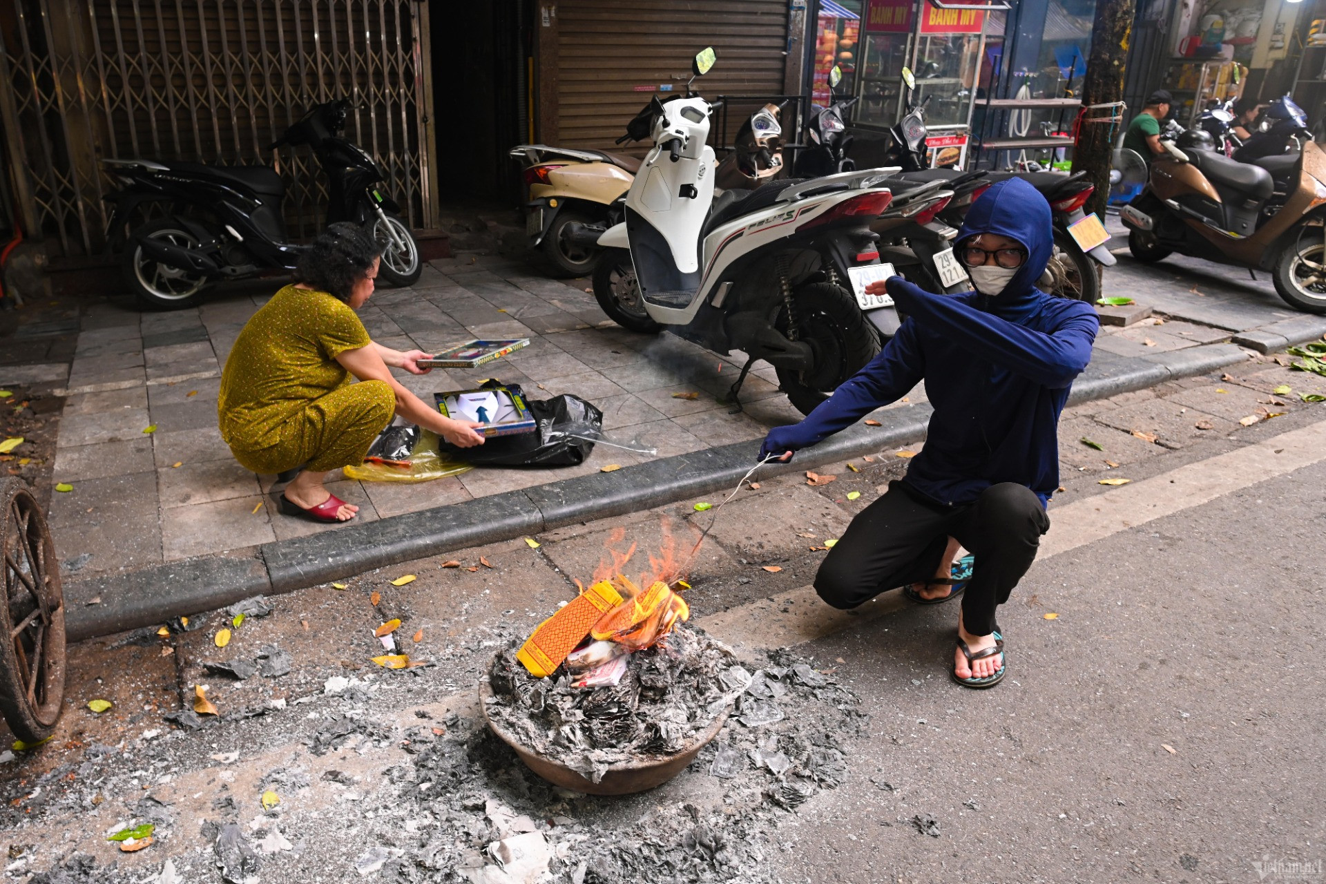 Hình ảnh tại phố Nguyễn Siêu (quận Hoàn Kiếm), do xe máy để tràn vỉa hè, một phụ nữ mang lò xuống lề đường để hóa vàng.