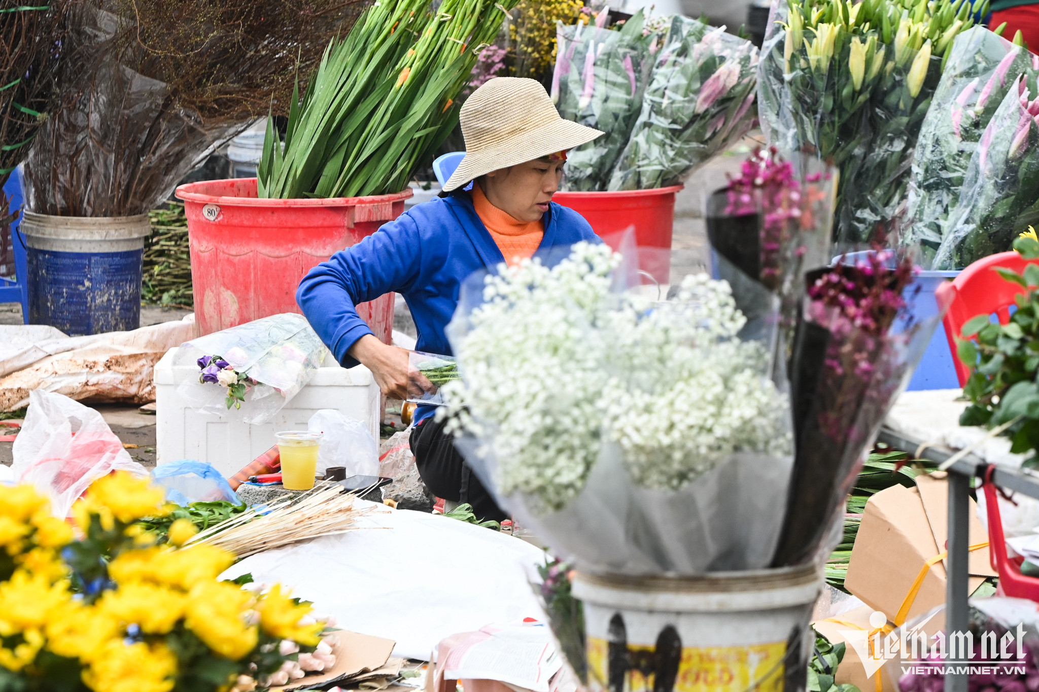 Những quầy hoa hết hàng, nghỉ sớm thì rác ngổn ngang sau một đêm giao dịch.