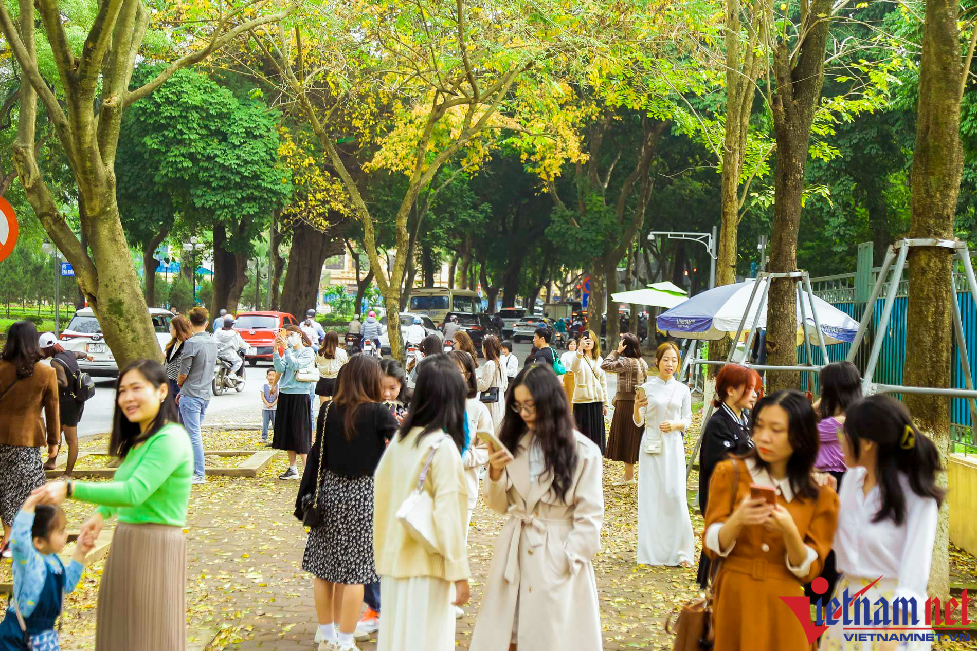 “Tình cờ lướt mạng xã hội thấy hình ảnh lá đổ vàng rất đẹp tại phố Hoàng Hoa Thám, nên tôi cùng bạn tranh thủ đến check-in trước khi hàng cây thay lá. Do nay là cuối tuần, nắng đẹp thế nên khi đến đây rất đông người”, chị Thành cho hay.