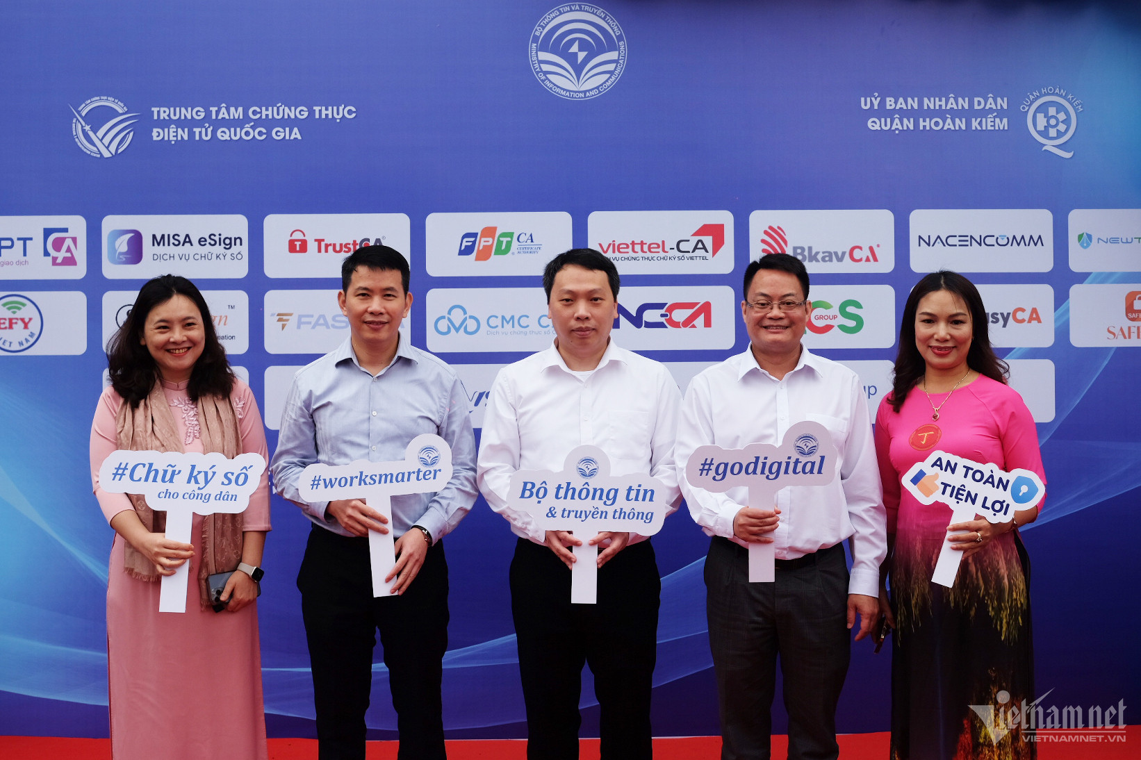 Sáng 8/4, tại phố đi bộ quận Hoàn Kiếm (Hà Nội), Trung tâm chứng thực điện tử quốc gia (Bộ TT&TT) đã phối hợp với UBND Quận Hoàn Kiếm, Câu lạc bộ chữ ký số và giao dịch điện tử Việt Nam cùng các doanh nghiệp triển khai thí điểm gian hàng cấp miễn phí chữ ký số cho công dân.