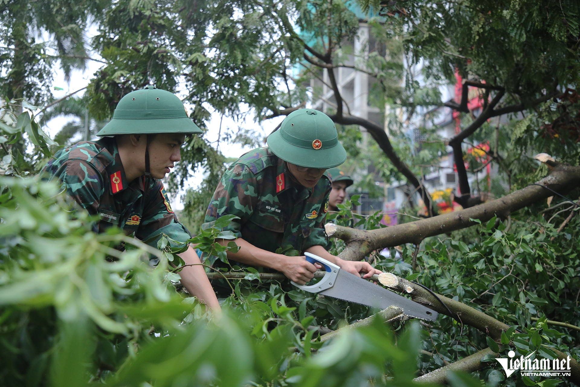 Học viện Quân y đã điều động hàng chục cán bộ, chiến sĩ chia thành nhóm để đi dọn dẹp cây xanh, cứu hộ ô tô bị đè bẹp tại đường Chiến Thắng, đường 19/5...
