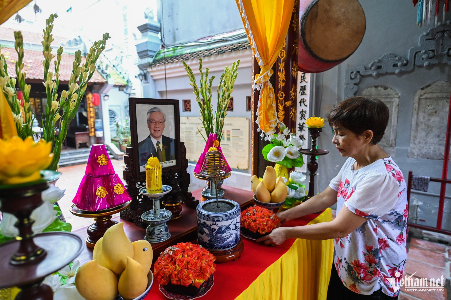 Một ban thờ được đặt tại đình Đông Thành trên phố Hàng Vải (quận Hoàn Kiếm) để người dân tới thắp hương tưởng nhớ Tổng Bí thư Nguyễn Phú Trọng, lúc 13h ngày 24/7.