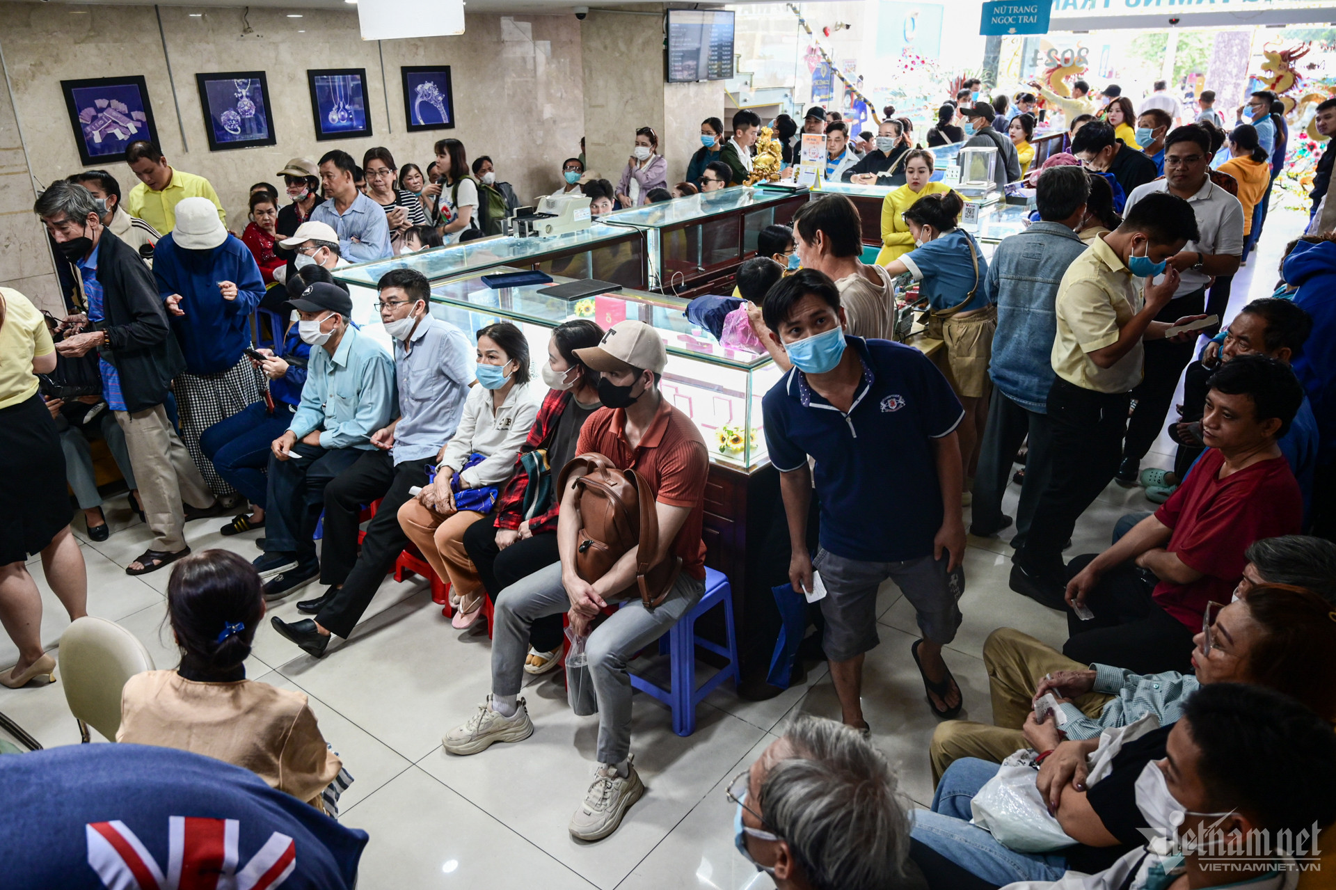 13h30, khách ngồi kín bên trong cửa hàng chờ tới lượt giao dịch. Trong ngày hôm nay, cơ sở này giới hạn mỗi người chỉ được mua 1 lượng vàng.
