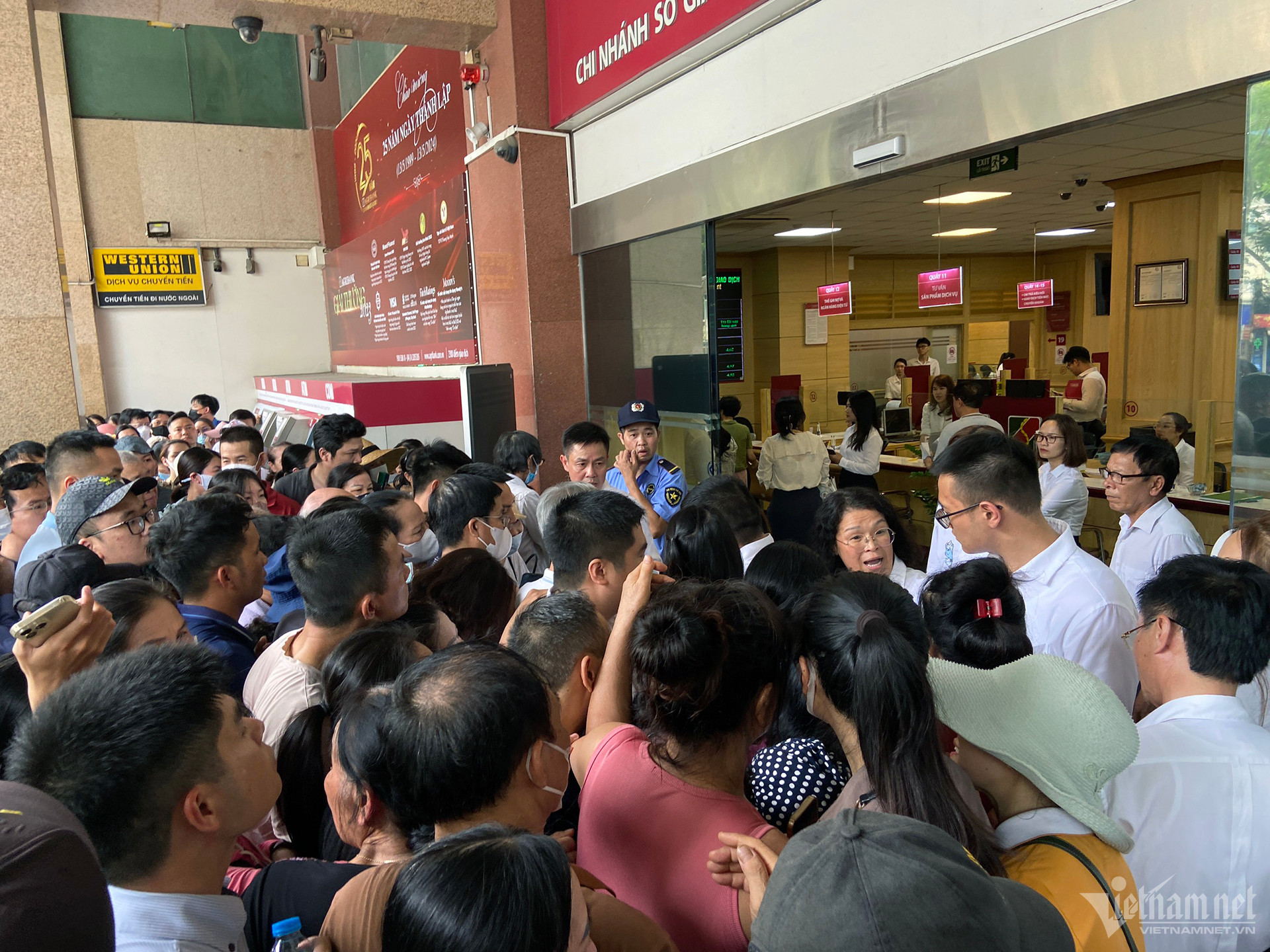 13h34, ngân hàng mở khe cửa nhỏ đón từng khách theo số thứ tự. Nhân viên yêu cầu khách xếp hàng dọc để vào lấy số thứ tự tại máy nhưng nhiều người đã phản ứng vì không thể biết ai đến trước, ai đến sau.