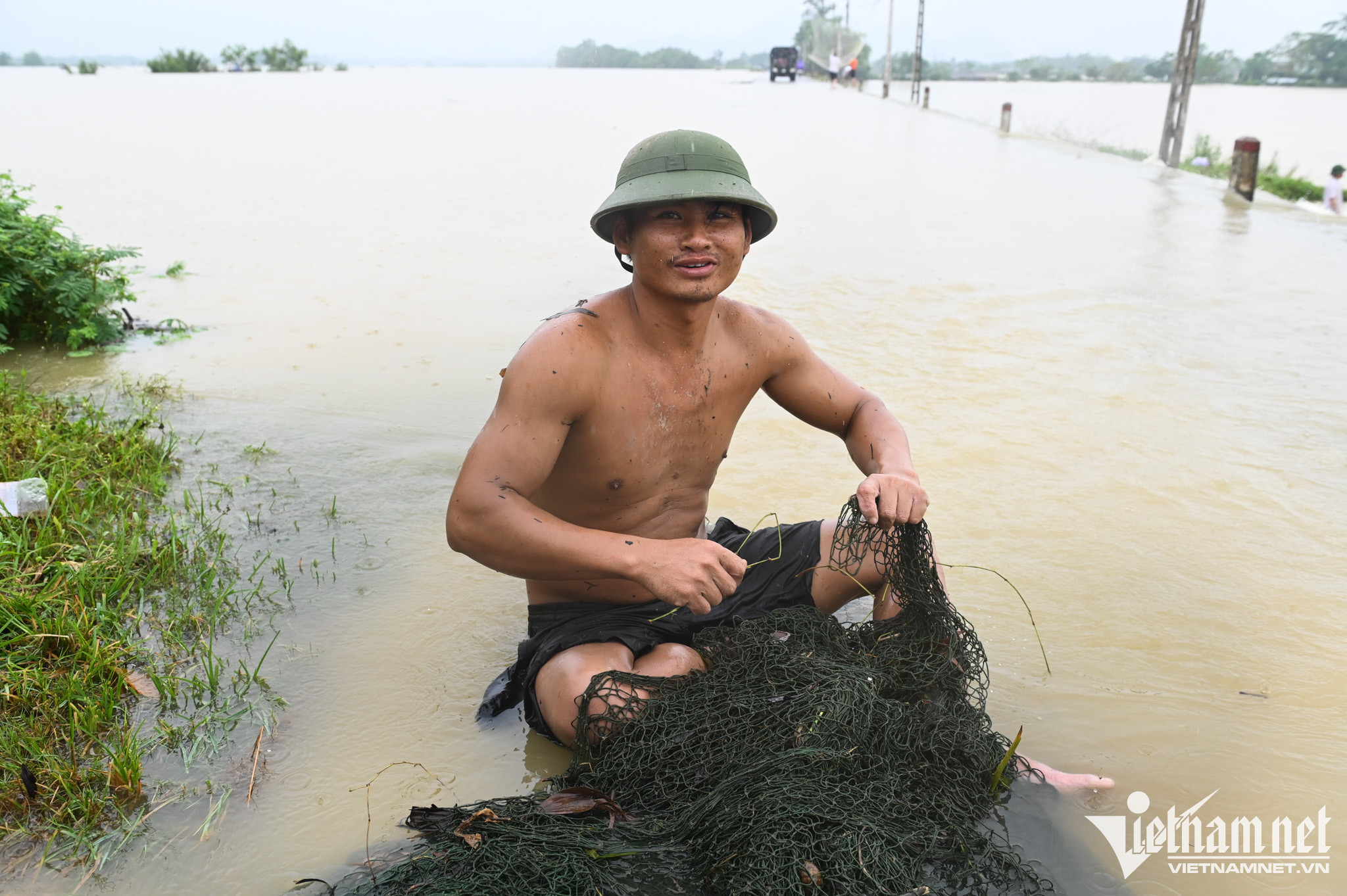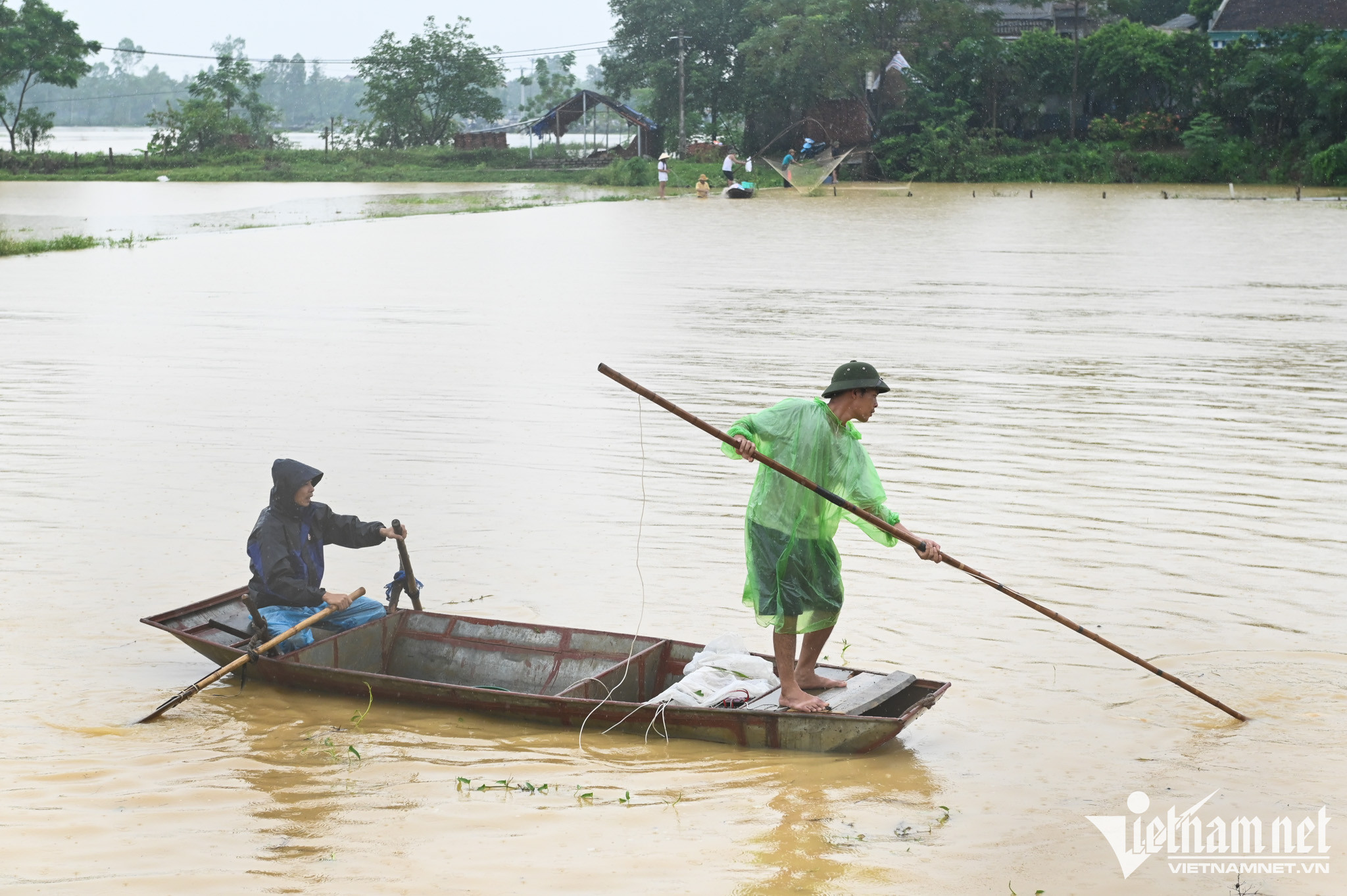 Cả một vùng nhìn đâu cũng thấy mênh mông nước. Cách một đoạn lại thấy người dân tranh thủ mưu sinh.