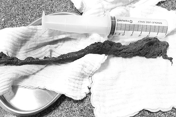 Sau khi nội soi ổ bụng, các bác sĩ phát hiện một khối dị vật là bã thức ăn nằm cuộn tròn như một cuộn dây, đầu trên nằm ở đoạn hang vị và môn vị đoạn còn lại nằm kéo dài từ tá tràng xuống ruột non.