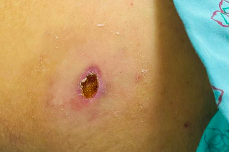 Bệnh nhân đã sốt kéo dài 7 ngày, kèm nhiều cơn rét run, đau đầu, mệt, chán ăn. Đặc biệt, anh có vết loét vảy đen 2x2cm ở vùng liên mấu chuyển xương đùi (gần xương háng) bên phải, có rỉ ít dịch, ấn tức nhẹ. Đáng nói, bệnh nhân chưa đi thăm khám, điều trị ở đâu. Khi cảm thấy mệt nhiều, anh mới nhập viện.