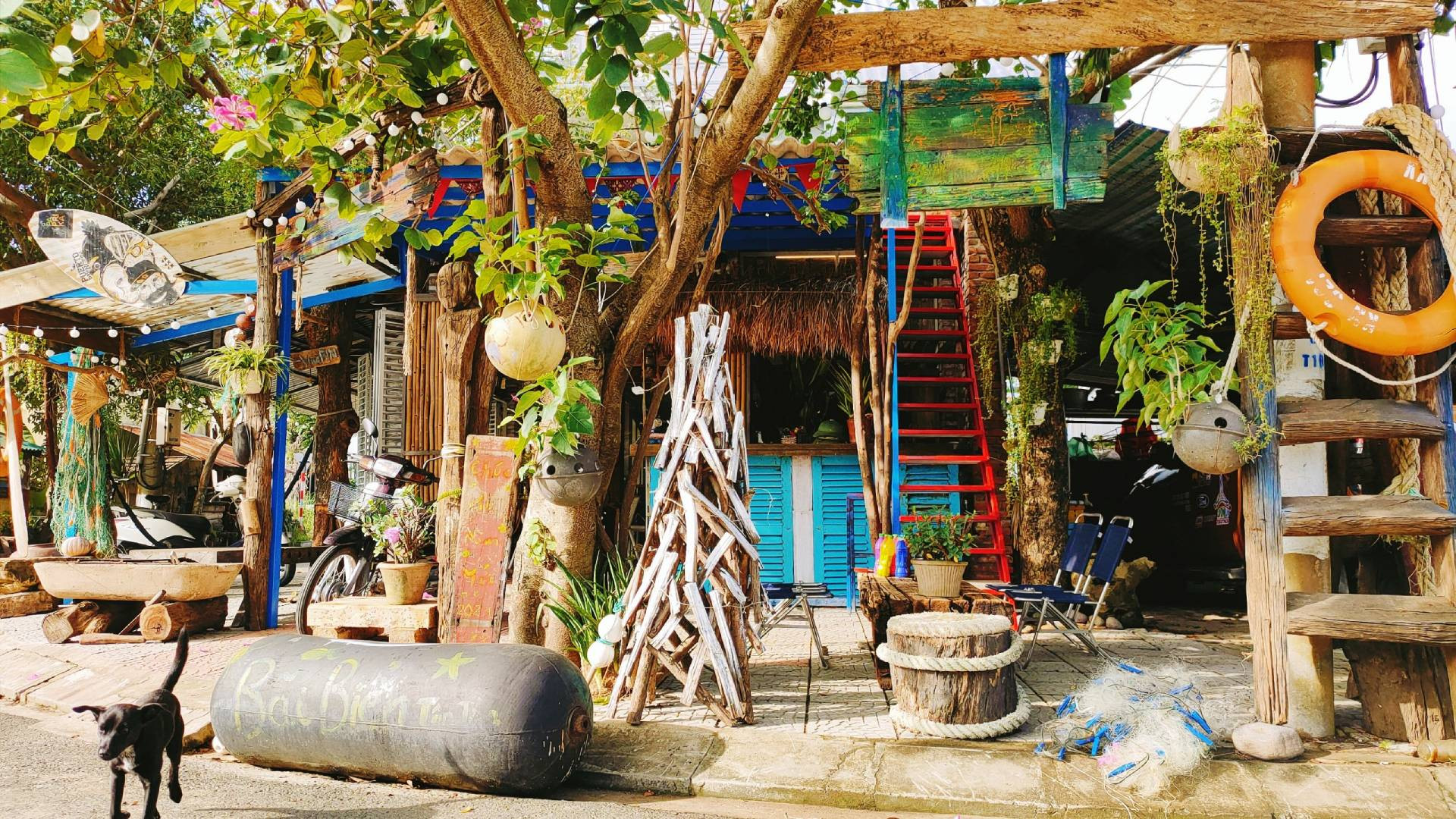 “Bếp nướng này làm từ chiếc bàn bi lắc vứt đi, khung gương, chiếc xích đu làm từ dây thừng, gỗ trôi dạt ở bờ biển, chậu cây này cũng làm từ gỗ mục nhặt về…”, anh Long giới thiệu.