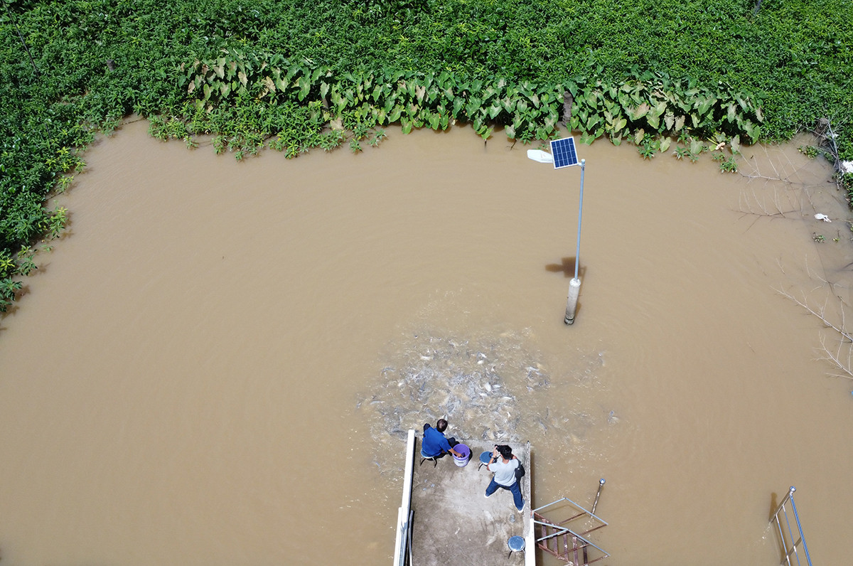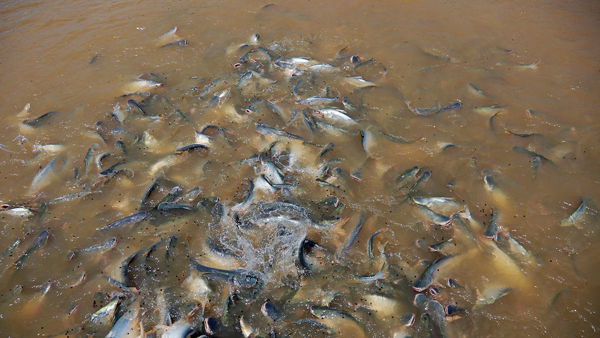 Mỗi khi nghe tiếng ông Nô cầm thau inox gõ vào ghế, đàn cá bơi về, túm lại, nổi lên quẫy đuôi như “thú cưng” chờ cho ăn. Xúc từng thau thức ăn lớn, ông Nô hất xuống sông, đàn cá tra ùa lên, há to miệng tranh nhau đớp, bọt nước văng tung tóe.