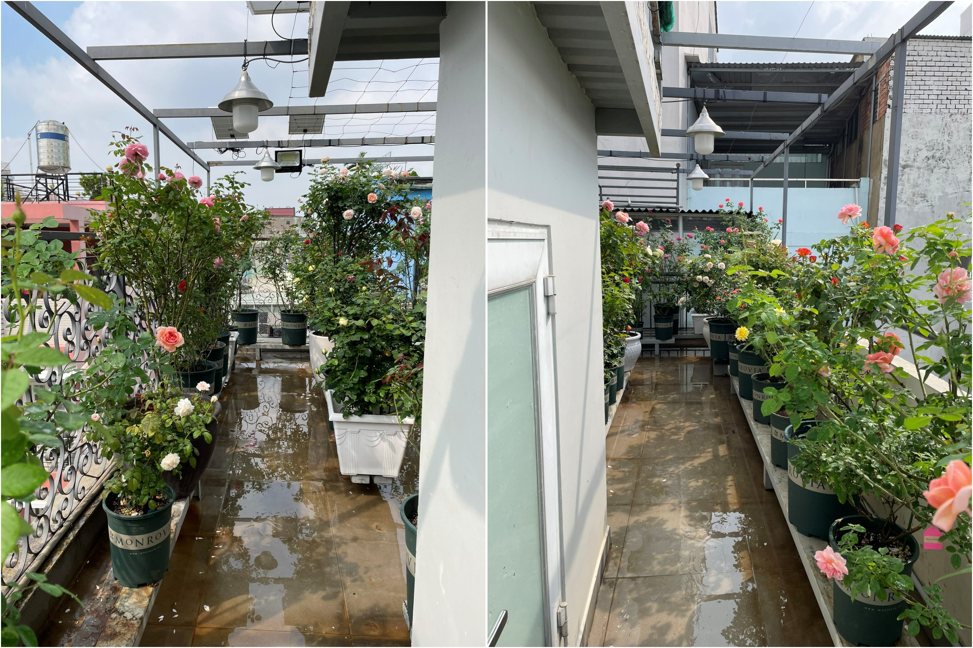 Sau 2 năm mày mò, anh Trường Trinh phủ kín khoảng không gian sân thượng rộng 50m2 bằng vườn hoa hồng rực rỡ sắc hương. Khu vườn trên sân thượng của anh có nhiều giống hoa hồng từ đại trà đến hiếm gặp như: lafon, corail gelee, jumilia, monalisa, lafon, butter cup, mac spice…