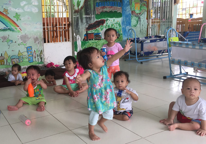 Tầng 1 của ngôi nhà được bố trí cho trẻ sơ sinh đến dưới 2 tuổi. Ở đây có 23 bé. Ngoài các bé lớn chạy nhảy tung tăng, nơi đây có 3 bé còn đỏ hỏn.