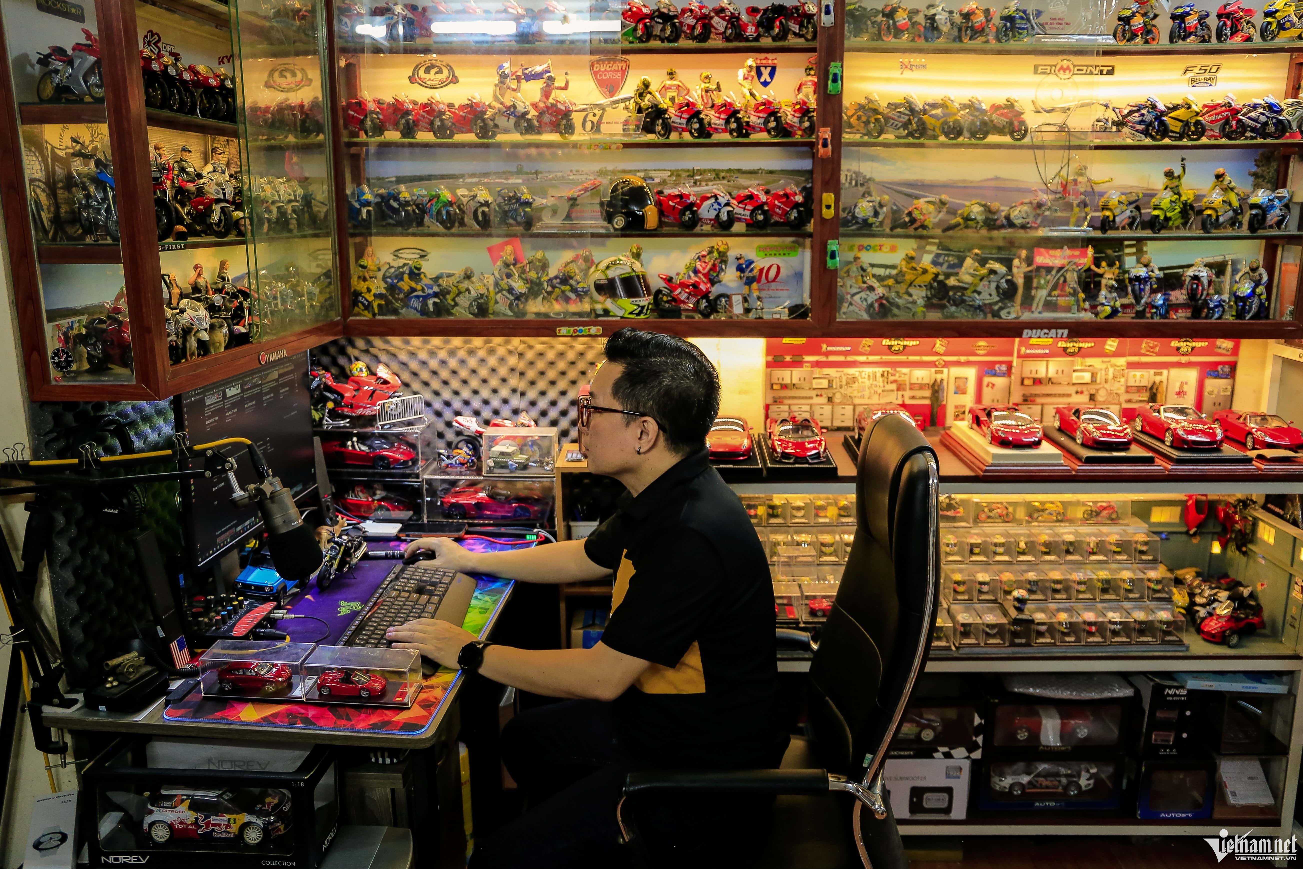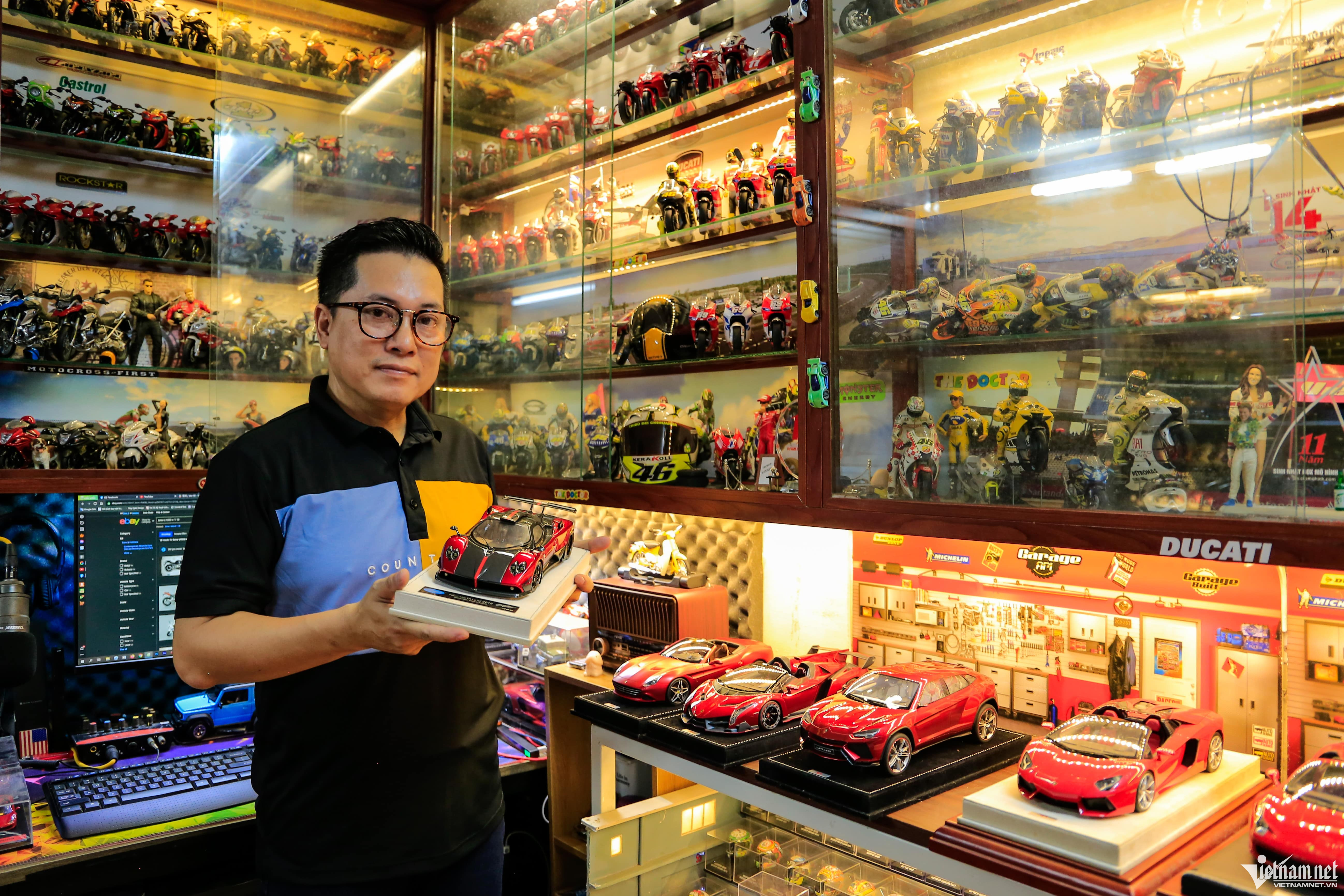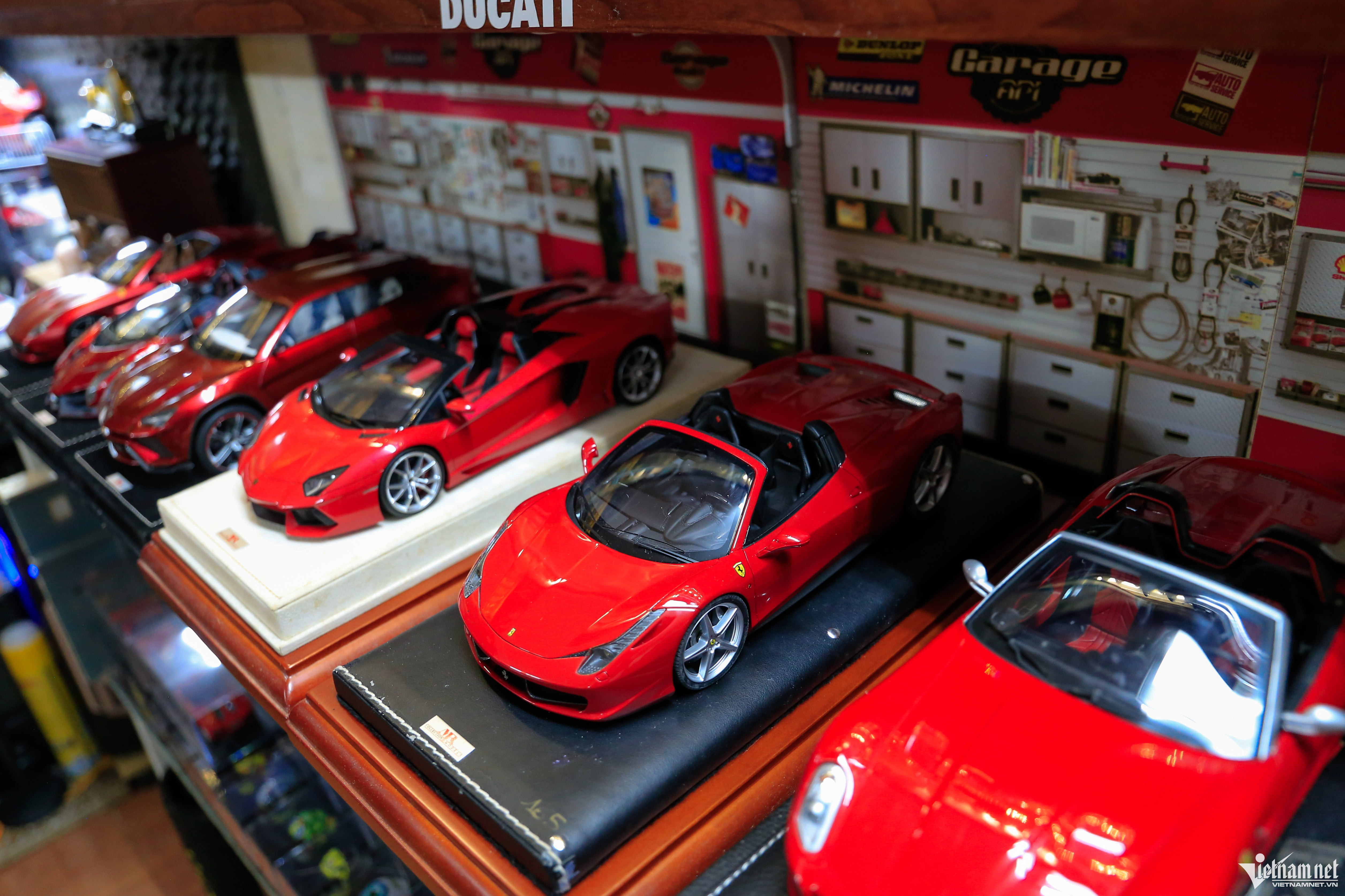 Anh Phạm Mạnh Linh (quận Đống Đa, Hà Nội) đang sở hữu hàng trăm mô hình tĩnh, chủ yếu đặt mua trên các trang mạng hoặc nhờ xách tay về từ các nước như Mỹ, Anh và Đức. Anh Linh bắt đầu tìm hiểu và biết tới mô hình này từ năm 1994 khi đang là sinh viên. Đến nay anh vẫn sưu tầm và săn lùng thêm nhiều phiên bản giới hạn trên thế giới. Những dòng xe nổi tiếng, đắt đỏ như Ferrari, Porsche... dựa trên nguyên mẫu có thật cũng có tại tủ trưng bày của anh Linh. Giá mỗi chiếc từ 10 triệu-20 triệu đồng. Trong ảnh là chiếc Ferrari Red Metaliic 2012, phiên bản giới hạn và chỉ có 20 chiếc được sản xuất trên toàn thế giới. "Tôi đang sở hữu chiếc thứ 17 được làm từ carbon, đặt mua tại Đức. Giá của nó hơn 20 triệu đồng, hơn 3 tháng sau tôi mới nhận được mô hình", vị chủ nhân cho biết. Anh Linh còn sưu tầm loại có cỡ nhỏ hơn, nhìn ngoại hình, nội thất không khác gì xe thật. Để sở hữu bộ sưu tập với phiên bản giới hạn anh mất rất nhiều công sức để tìm kiếm ở nước ngoài hay thức trắng đêm canh giờ đấu giá qua các kênh trực tuyến.Ngoài dòng ôtô mô hình hạng sang, anh còn sưu tầm thêm các loại xe đua. Chiếc xe trong ảnh được tổ chức tại cuộc thi Ford Fiesta RS WRC ở vùng Alsace (Pháp) năm 2012 của đội đua M-Sport Ford World Rally. Trên thế giới chỉ có 504 chiếc.