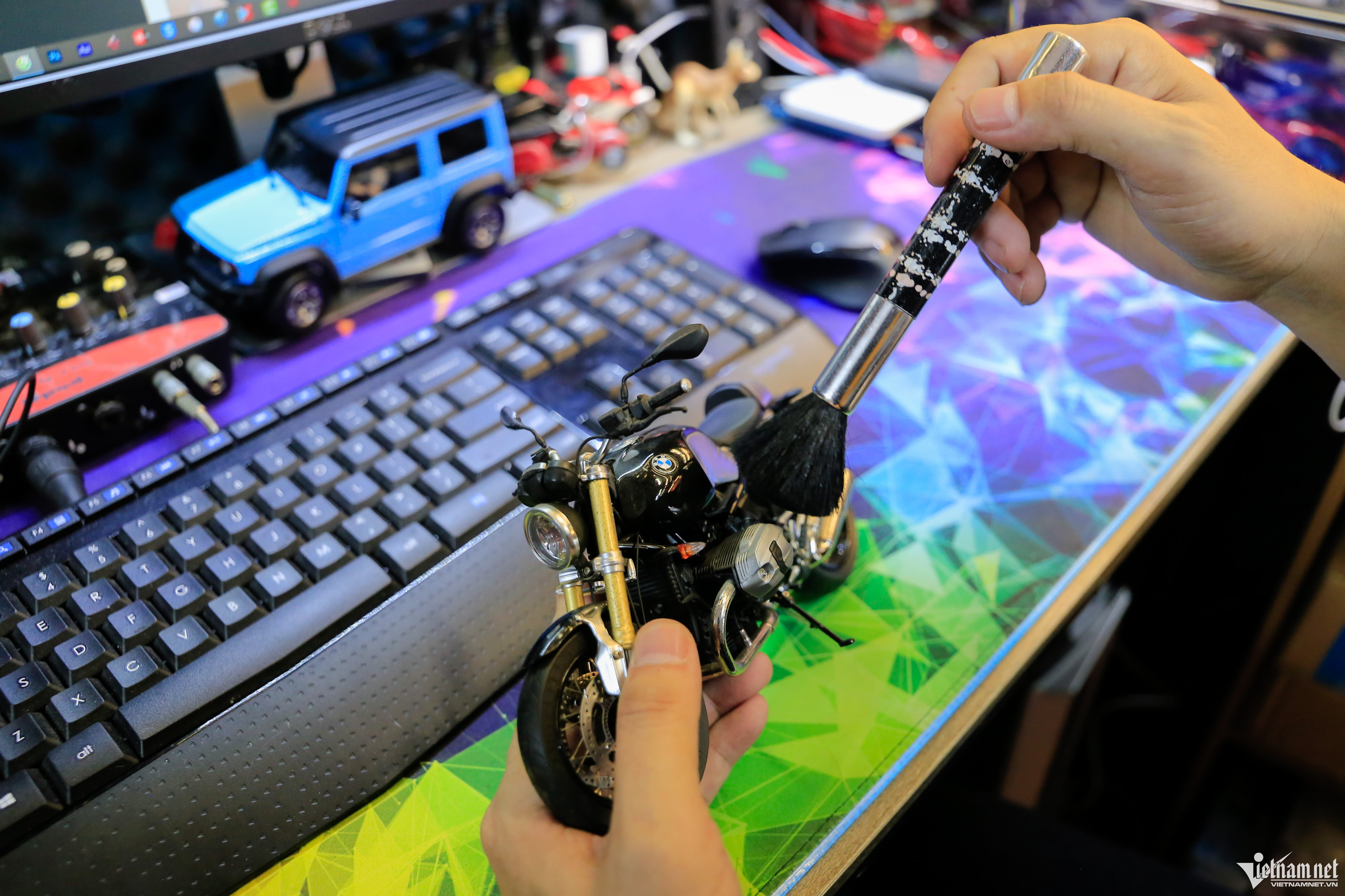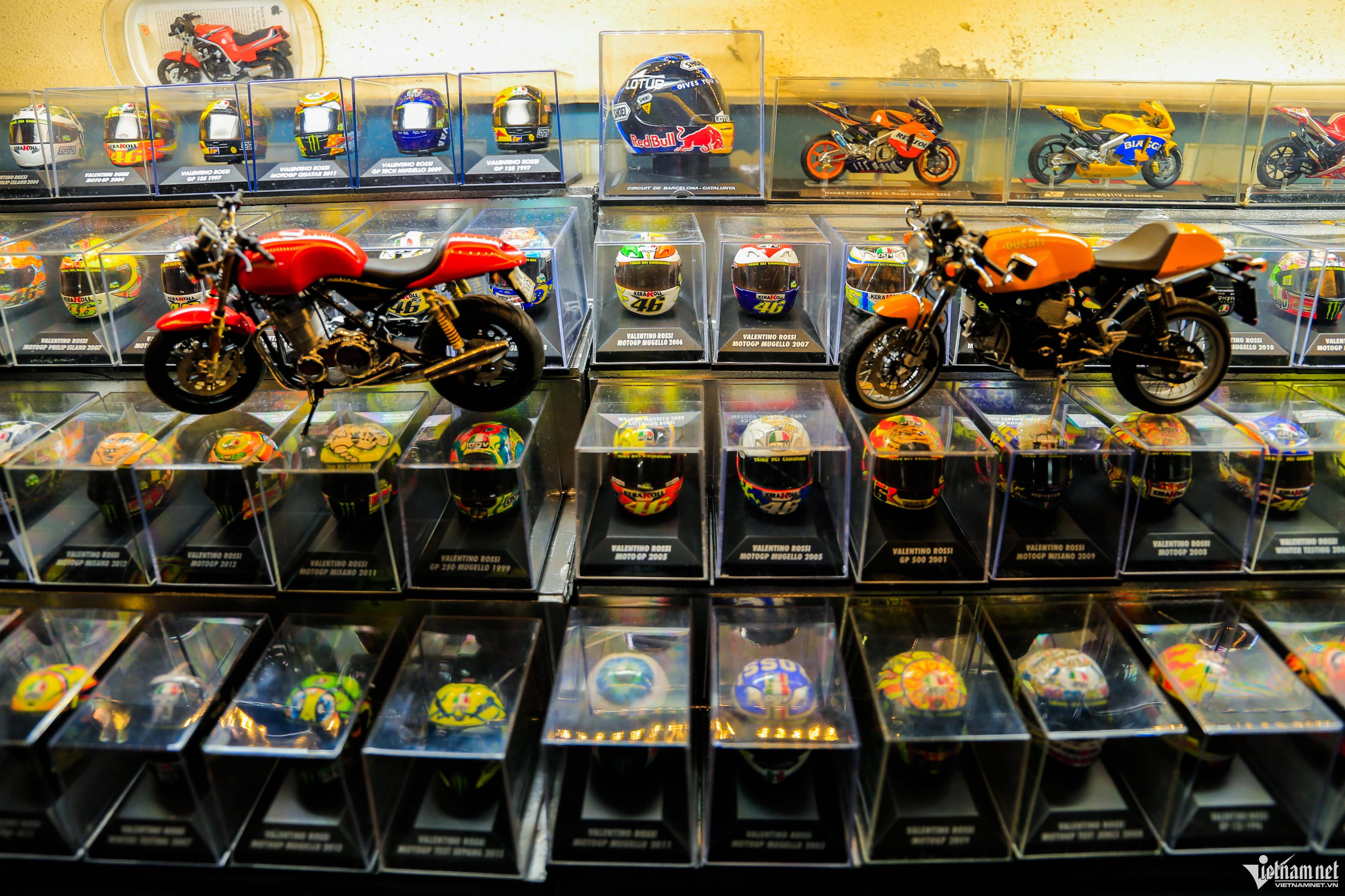 Những chiếc mũ bảo hiểm mô phỏng tay đua Valentino Rossi hay dùng cũng có tại đây. Giá mỗi chiếc từ 700.000 - 1 triệu đồng. Chiếc Kawasaki Ninja Zx-9r (tỷ lệ 1:18 so với xe thật) từ 28 năm trước. Đây là chiếc xe đầu tiên trong bộ sưu tập mà anh Linh sở hữu, giá 200.000 đồng.Để bảo quản mô hình có tuổi thọ được lâu dài, anh thường xuyên lau chùi bên ngoài, sử dụng wax dưỡng bóng và dùng tủ kính chống bụi bẩn. Sau gần 28 năm sưu tầm, anh Linh đã sở hữu hơn 400 chiếc xe mô hình, tổng trị giá khoảng 1 tỷ đồng. Trong tương lai, anh mong muốn mở rộng không gian để có thể trưng bày tất cả, đồng thời là nơi thư giãn sau mỗi ngày làm việc căng thẳng.