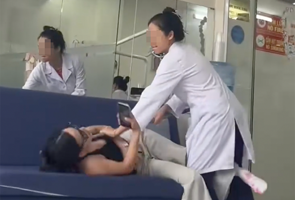 Sau đó, người đàn ông này bất ngờ chạy vào phòng khám, giật bút trên bàn làm việc, vòng tay qua cổ khống chế bác sĩ Thúy, đồng thời có lời nói và hành động đe dọa "chọc vào mặt". Hành vi này đã được camera an ninh ghi lại.