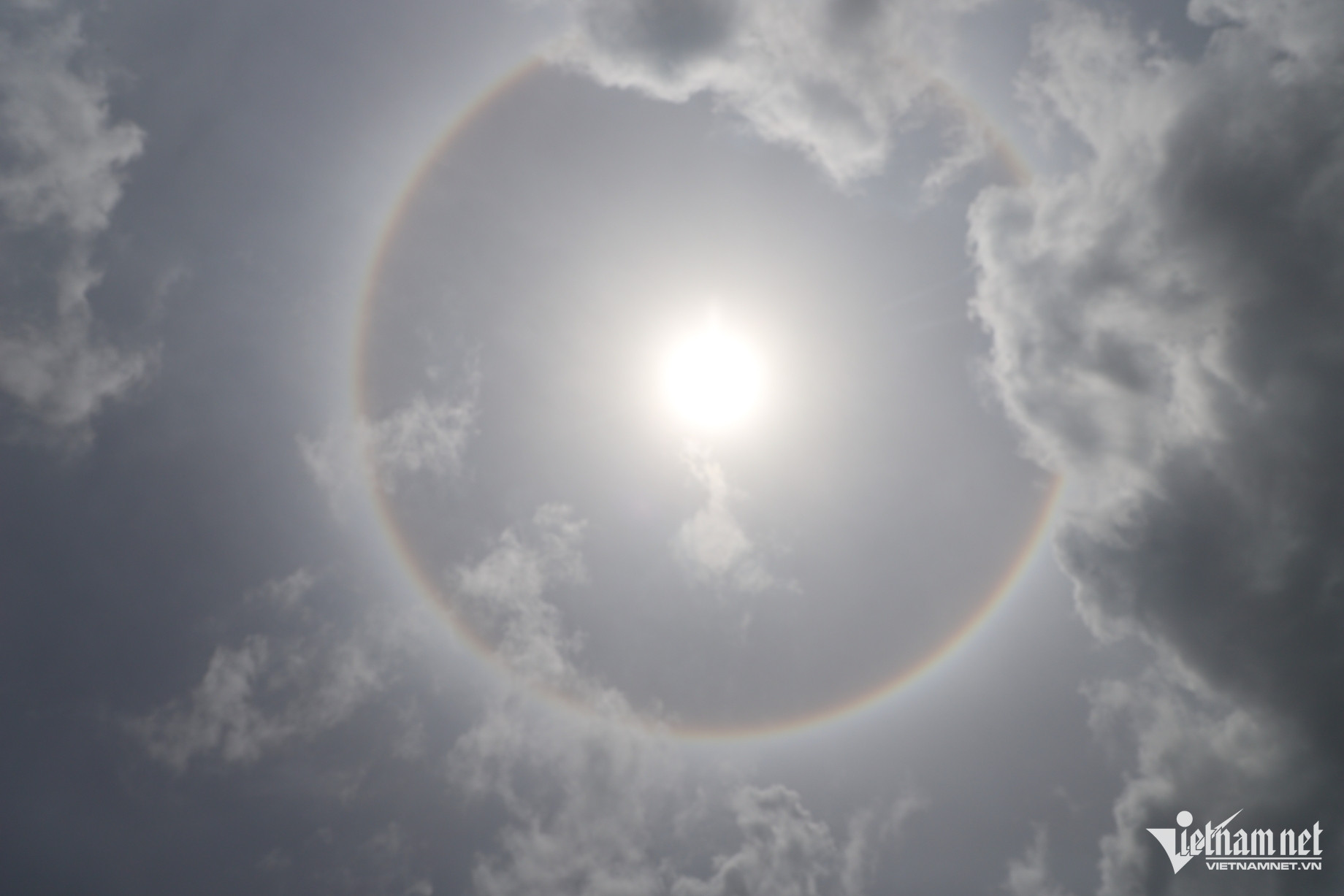 Theo đó, người dân sinh sống tại các quận 1, 3, 4, 5, 8, Bình Thạnh... bất ngờ khi thấy một vòng tròn lớn với đủ sắc màu cầu vồng bao quanh mặt trời chói chang.