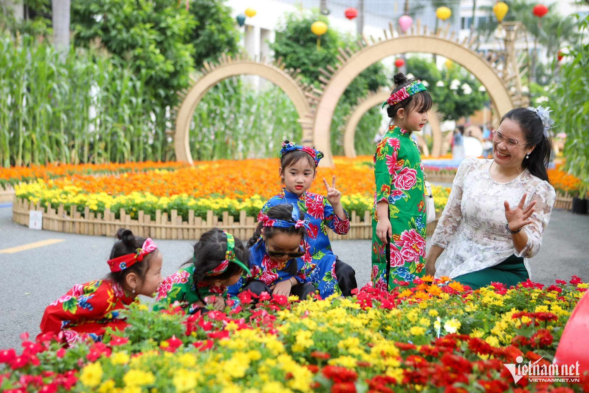 Các em học sinh trường mầm non Minh Phú (quận 7, TPHCM) được cô giáo lên đồ để đi dạo đường hoa.