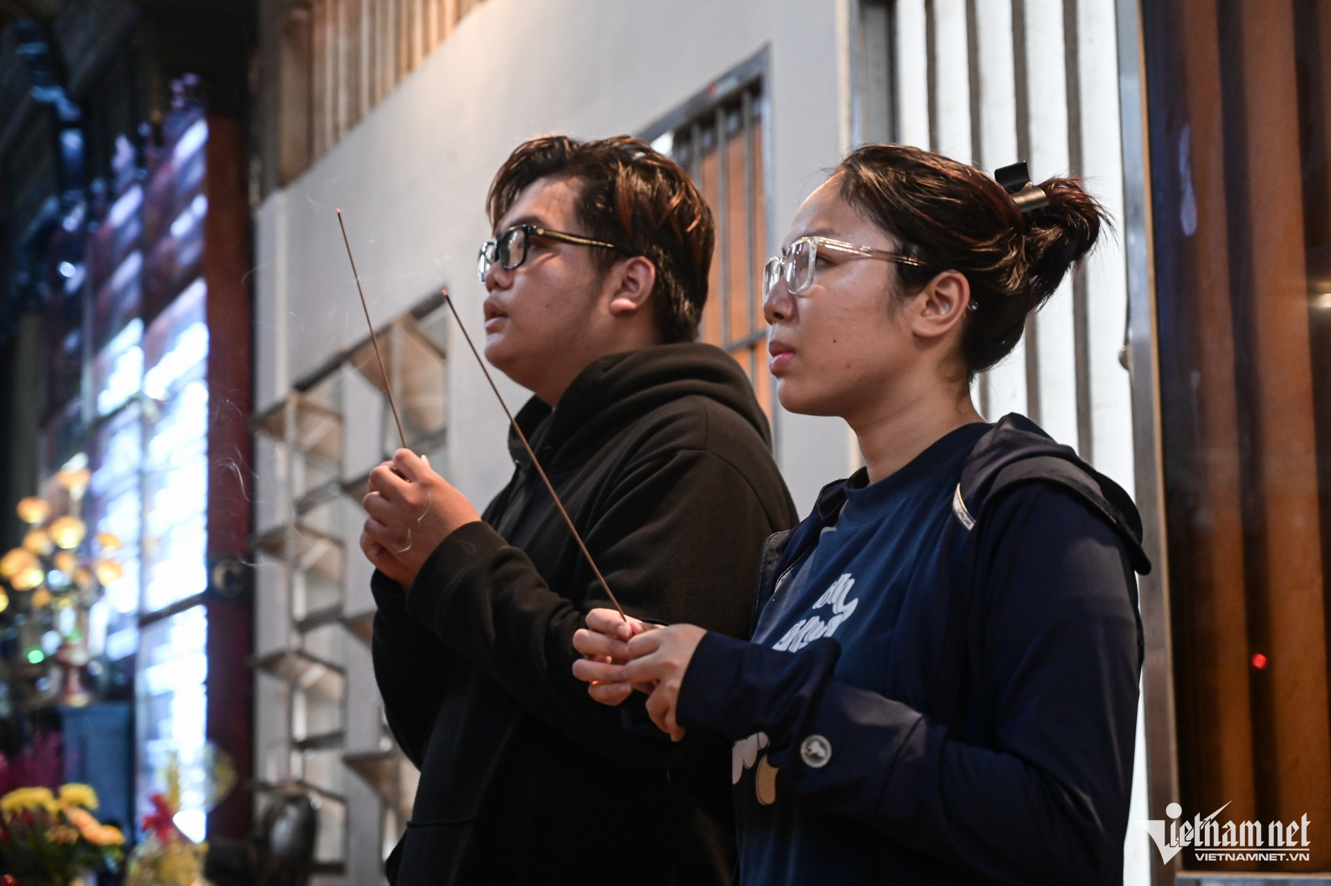 Bạn trẻ Đặng Đăng Khoa (quận Bình Tân) cùng nhóm bạn tới chùa Vĩnh Nghiêm thắp nhang, kính cẩn nghiêng mình trước di ảnh Tổng Bí thư Nguyễn Phú Trọng.