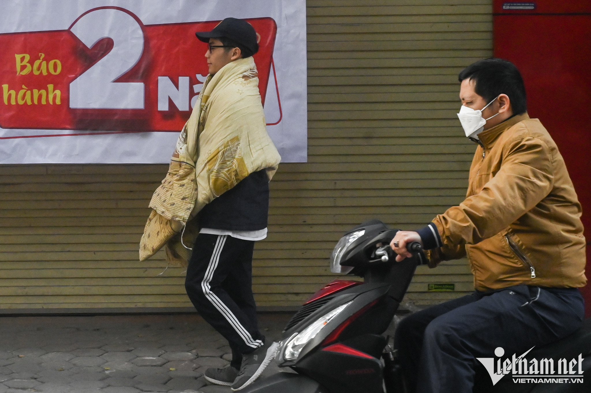 Một thanh niên quây chăn kín người khi phải ra khỏi nhà lúc sáng sớm. Cậu cho biết vì lạnh quá, ngại chui ra khỏi chăn nên cứ thế cuốn đồ từ trên giường đi. Đây được xem là đợt lạnh nhất từ đầu mùa đông đến nay. Trong ngày hôm qua, nhiều khu vực vùng núi cao đã xuất hiện băng tuyết khi nhiệt độ xuống dưới 0 độ C.