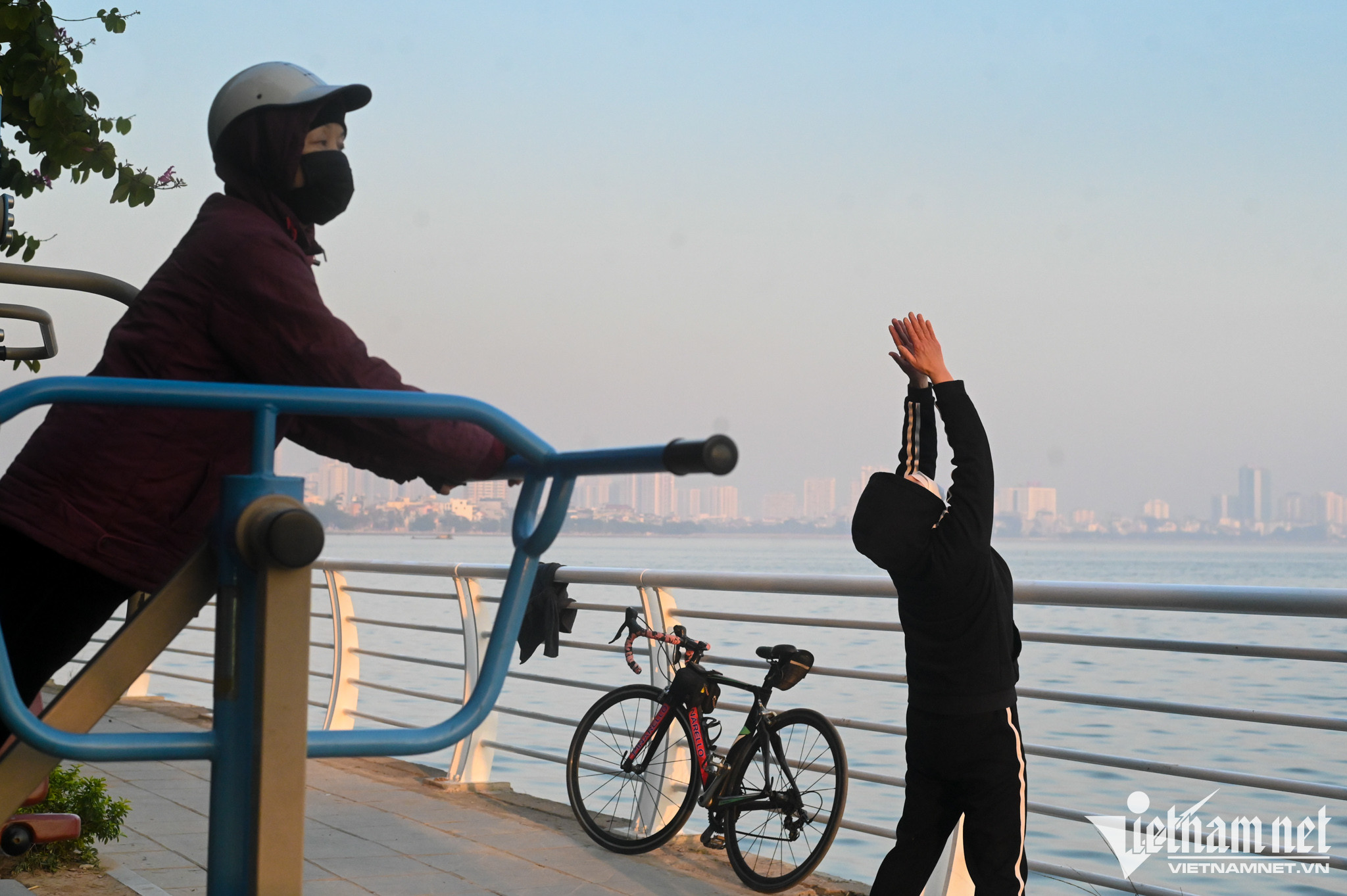 Ở ven hồ Tây, người dân vẫn đi tập thể dục từ sáng sớm và tranh thủ sưởi nắng đầu ngày. Đến buổi trưa, nắng ấm dần lên nhưng mọi người vẫn dễ cảm thấy khô hanh.