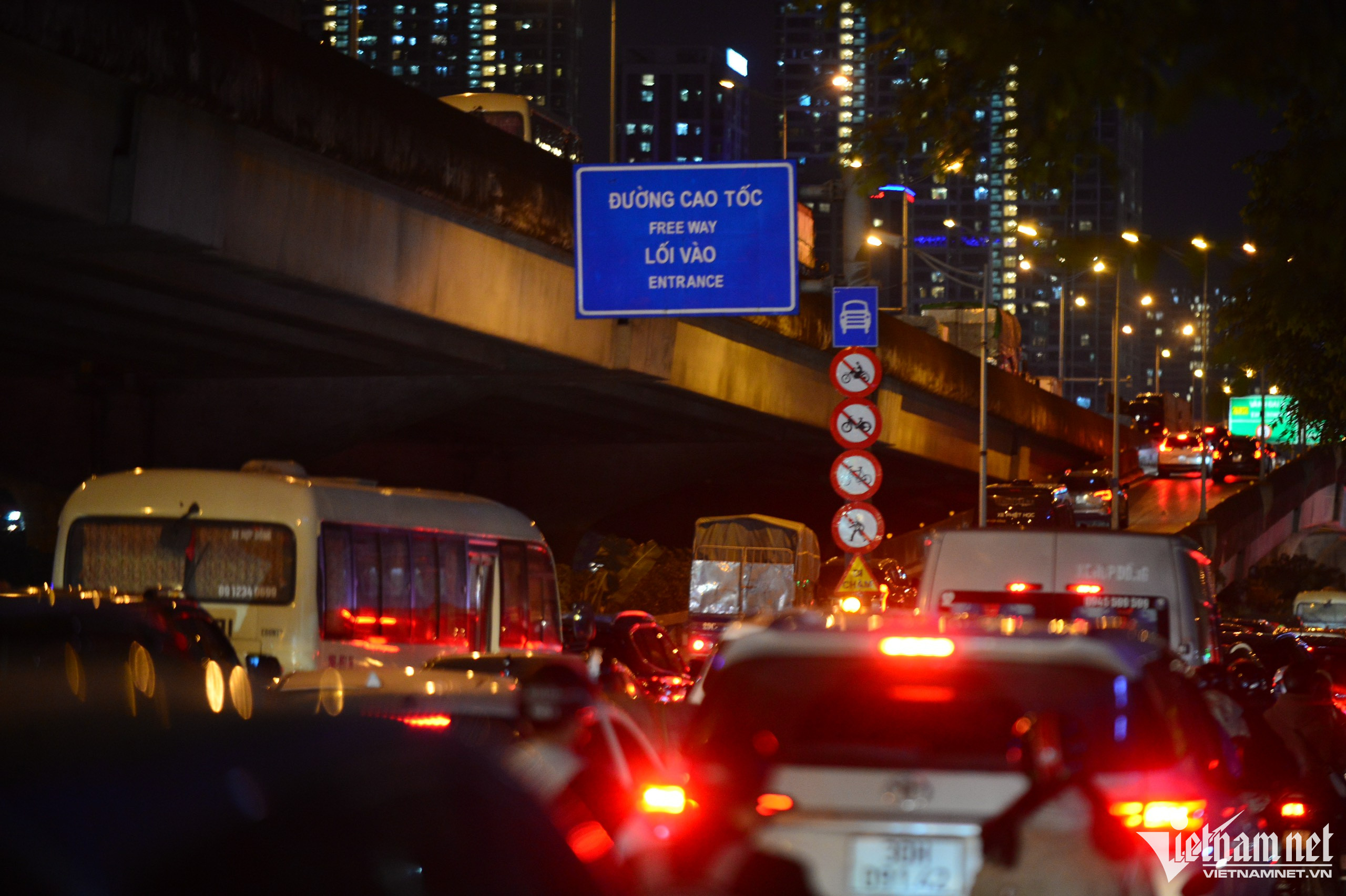 Lối lên đường trên cao Vành đai 3 tại đoạn Phạm Hùng lúc 18h30. Đây là cung đường gây ám ảnh nhất về tình trạng ùn tắc kéo dài đối với nhiều tài xế vì không còn cách lựa chọn nào khác để ra và vào thủ đô.