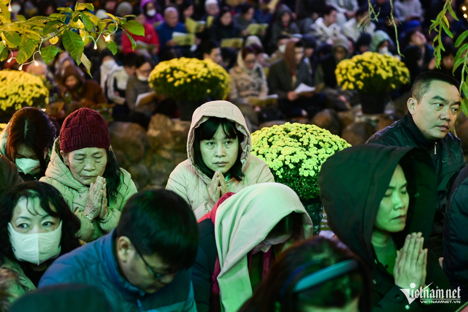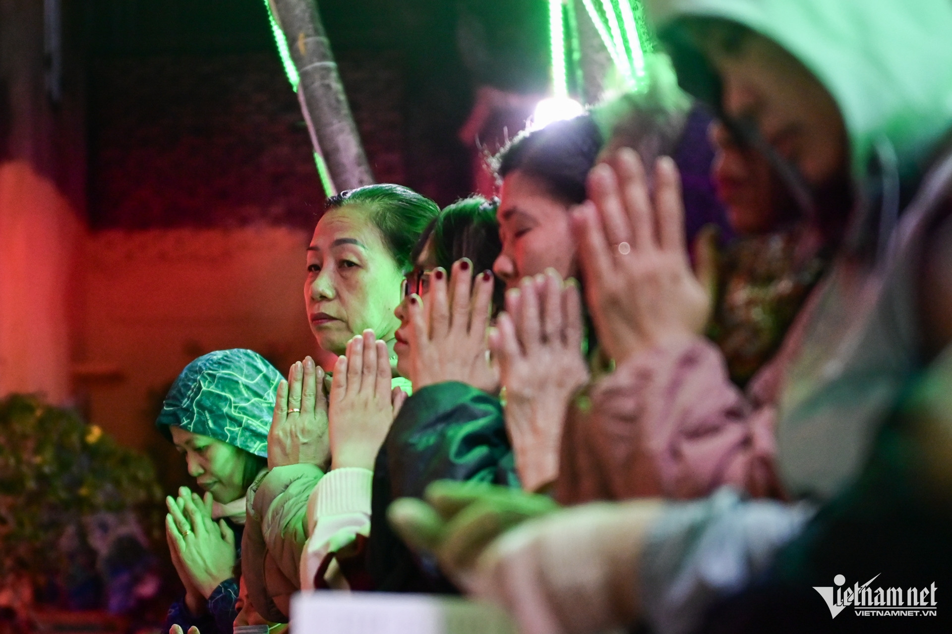 Hà Nội tối 5/2 lạnh 17 độ C, nhiều người ngồi ngoài trời ít nhất 2 tiếng từ khi chờ nhà sư tụng kinh đến khi kết thúc buổi lễ.