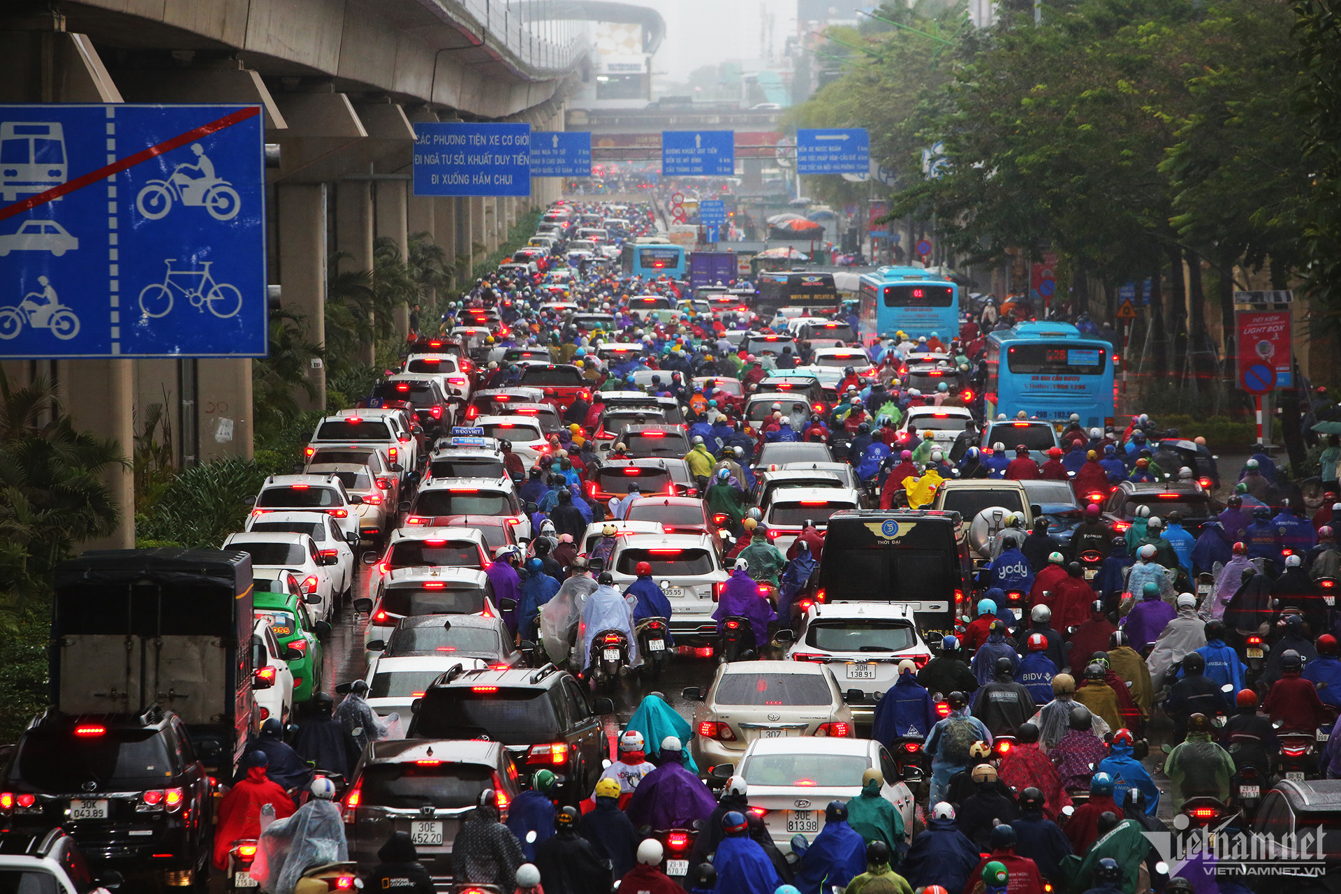 Đường Nguyễn Trãi (đoạn lên cầu vượt Ngã Tư Sở), tình trạng ùn tắc trở nên trầm trọng khi có đến 9 hàng ô tô "án ngữ" mặt đường, xe máy phải luồn lách để tìm lối đi. Nhiều thời điểm, xe máy không thể "nhúc nhích" khiến người dân phải gạt chân chống xe, lướt điện thoại để chờ đến lượt đi.