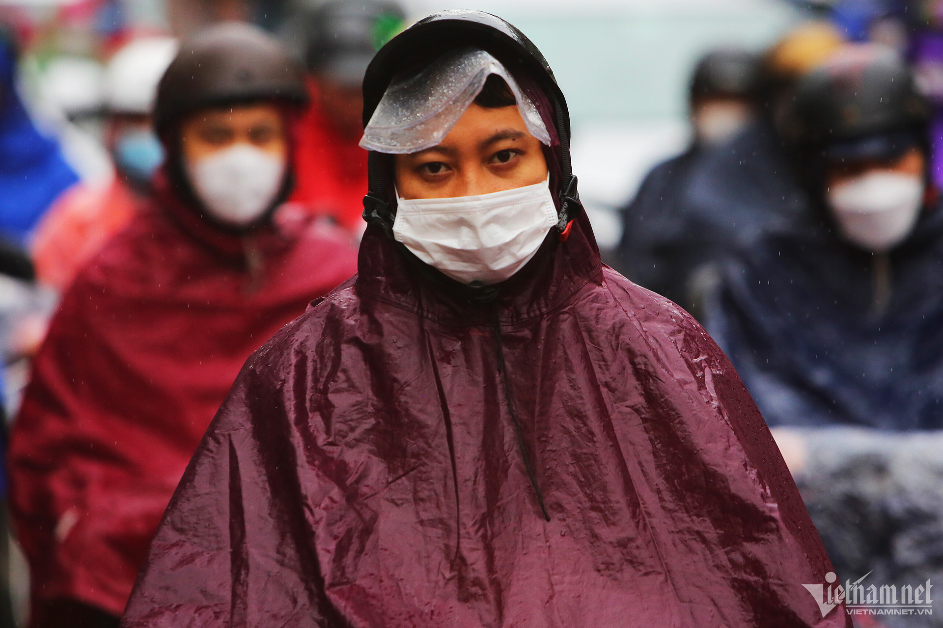Sáng 1/12, ảnh hưởng của không khí lạnh, nhiệt độ ngoài trời ở Hà Nội hạ thấp ở ngưỡng gần 21 độ, trời rét kèm mưa khiến nhiều tuyến đường ùn tắc.
