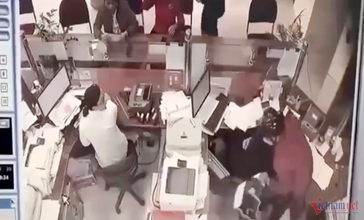 Khi vào bên trong, người này vẫn đội mũ bảo hiểm trên đầu, tay trái cầm một túi xách, tay phải cầm một vật giống dao, ghì cổ khống chế nữ nhân viên ngân hàng. Lúc này, nữ nhân viên đang ngồi trên ghế thì bị kéo lùi ra phía sau, trong khi phía trước đang có khách hàng đứng chờ giao dịch.