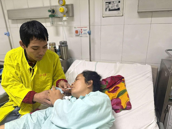 Bên giường bệnh của vợ, anh Hoàng Văn Tân (SN 1991) lo lắng, trên tay cầm điện thoại không ngừng gọi cho từng người thân, quen để hỏi vay tiền. Chỉ mới qua 4 tháng, gia đình anh đã lâm vào cảnh kiệt quệ. Đưa ra nắm tiền nhàu nhĩ trong túi, anh bảo: "Tôi còn có nhiêu đây, chắc chưa nổi 1 triệu. Hàng ngày tôi đi xin cơm từ thiện, cố tằn tiện được chút nào hay chút ấy".