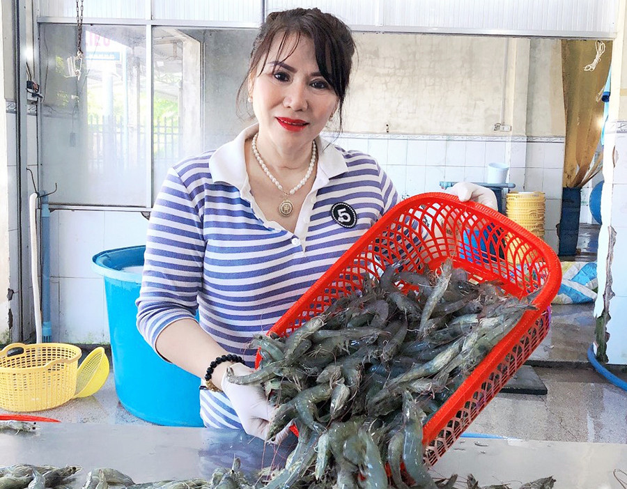 Hiện, bà có hơn 100 ao tôm công nghệ cao của gia đình và hợp tác với nông dân trong vùng, mỗi ao rộng từ 1.000 – 1.500m2.