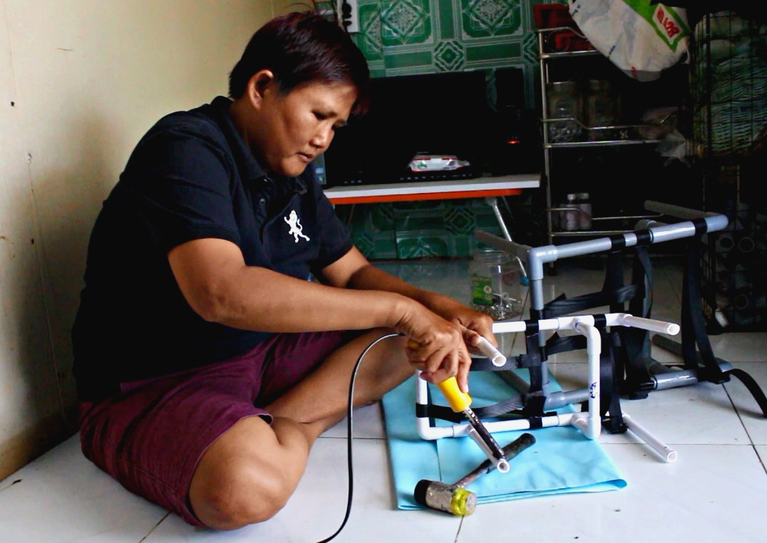 Để con mèo tự di chuyển, chị tìm mua xe lăn nhưng ở Việt Nam không bán. Thế là chị tự mày mò, thiết kế xe lăn cho thú cưng của mình bằng ống nước.
