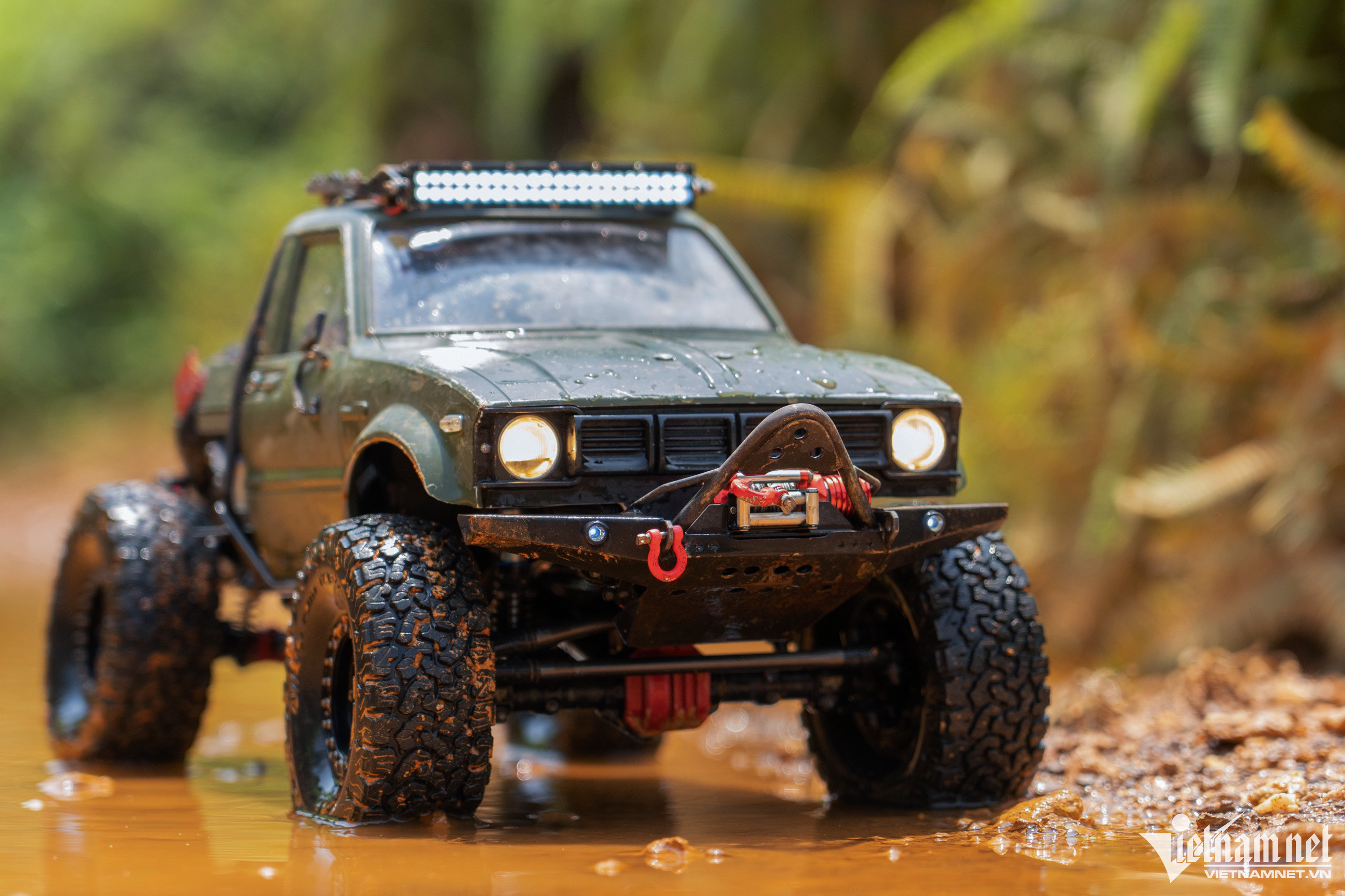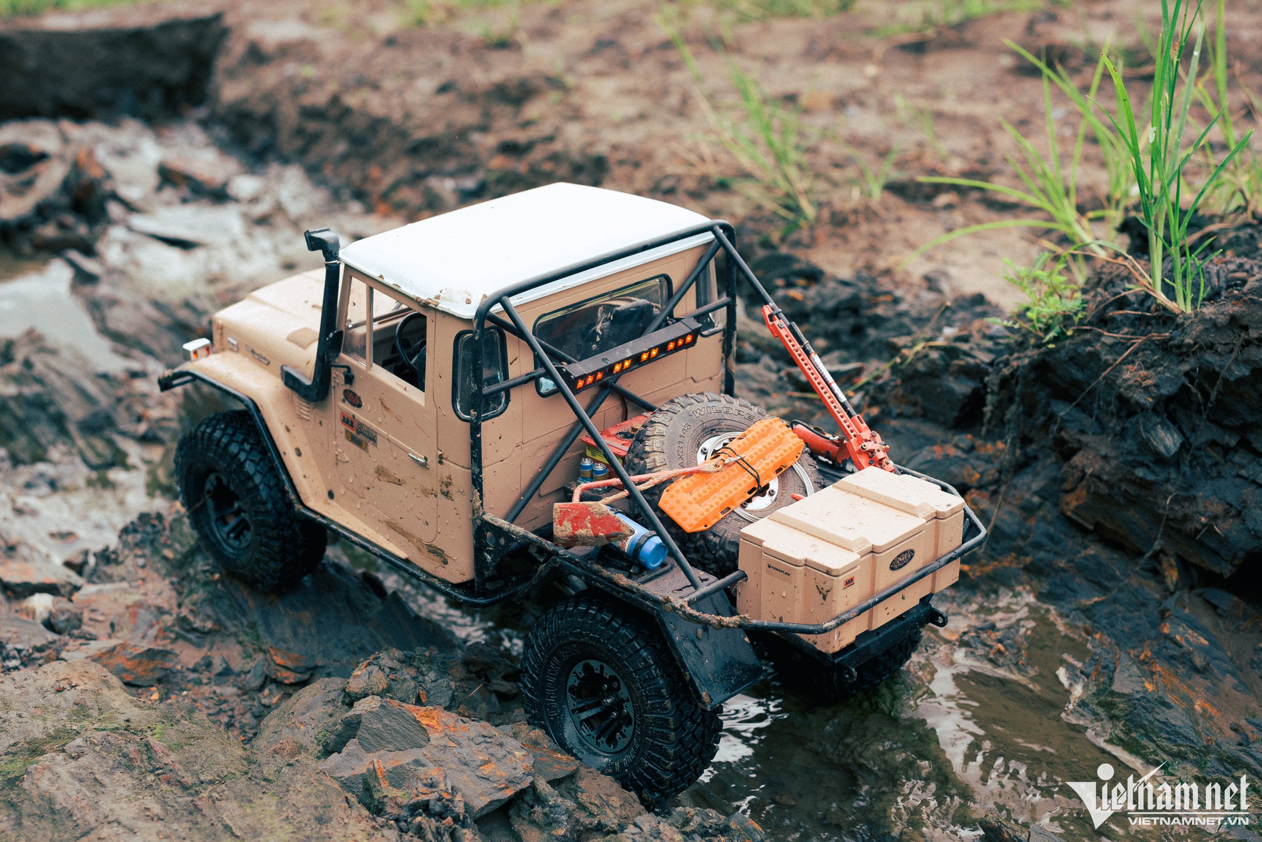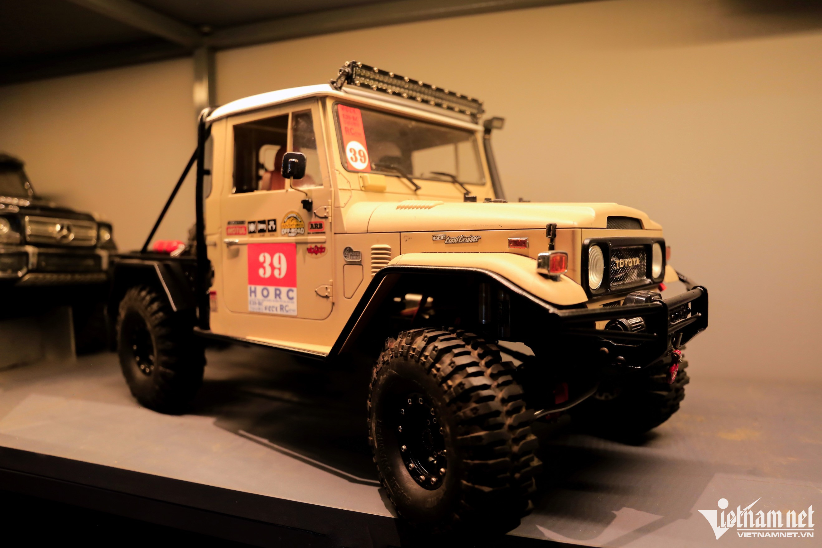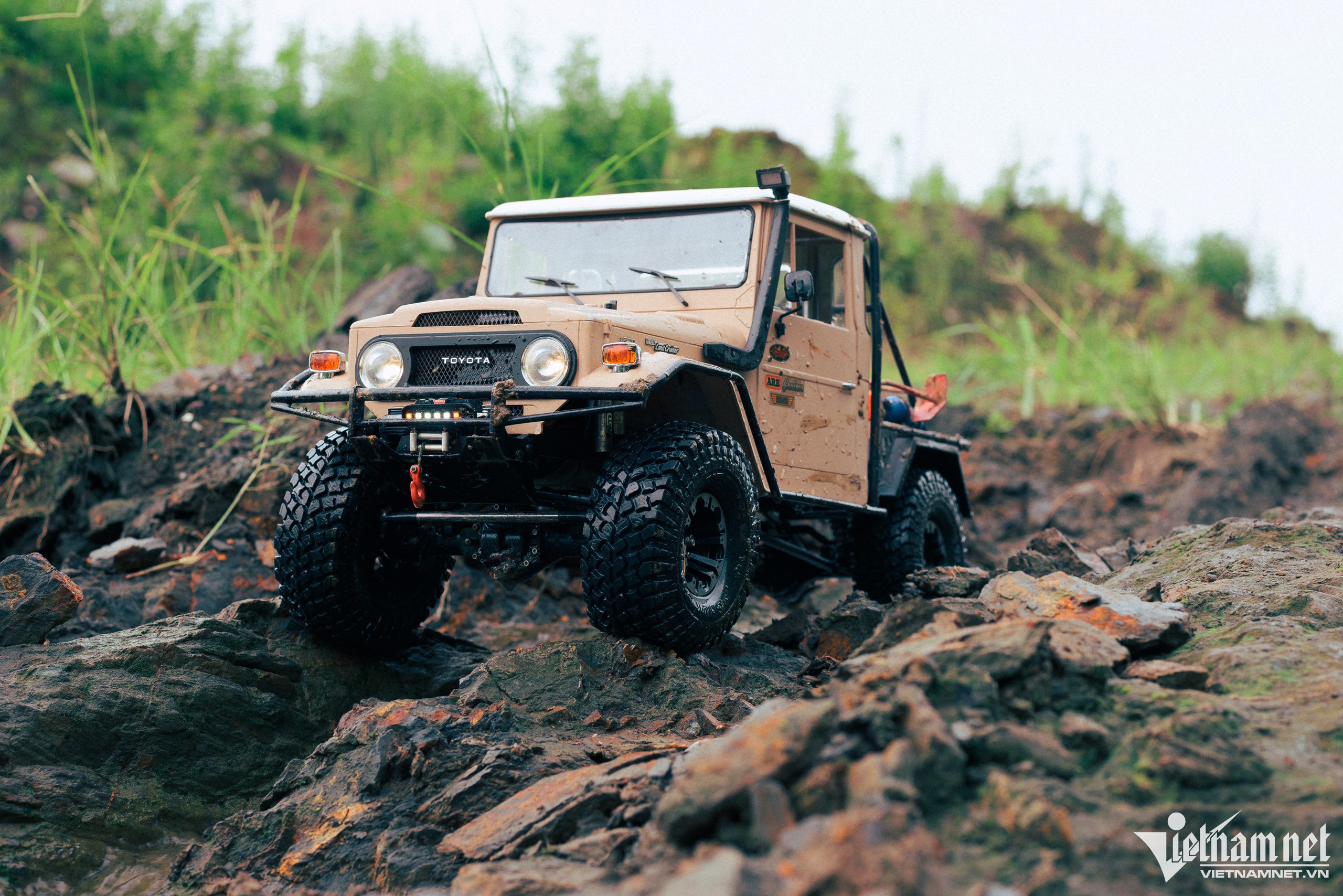 Trong ảnh là chiếc xe Land Cruiser 79 bản tỷ lệ 6x6, dòng xe nổi tiếng tại Australia. "Sau khi nhìn mô hình trên mạng xã hội, tôi khao khát có được nó và dành gần 2 năm để chuẩn bị linh kiện. Tôi nhờ các thành viên trong câu lạc bộ sáng chế một số phụ kiện để hàn gắn thay đổi toàn bộ kết cấu. Chi phí để hoàn thiện mô hình này đã tiêu tốn gần 50 triệu đồng", anh chia sẻ. Chiếc Toyota Landcuiser FJ45 được lược bỏ một số chi tiết thừa, nâng cấp bánh to và phình hơn. Khi đi vào địa hình hiểm trở có sỏi đá, bùn lầy xe sẽ thích nghi tốt. Những chiếc xe còn nguyên vết bẩn, không rửa mới thấy đúng chất "dân chơi off-road". Chạy trên địa hình bằng phẳng, nó có thể đạt vận tốc đến 150km/h, ngoài ra còn biểu diễn được một số kỹ thuật như drift, cua gắt.Để điều khiển một chiếc xe thành thạo theo ý của mình, người chơi phải rèn luyện khoảng 6 tháng đến một năm. Vị chủ nhân những chiếc ôtô này cho rằng anh phải giống như một tài xế lái xe thật, biết điều tiết ga và nắm rõ sự chuyển động của bánh xe.