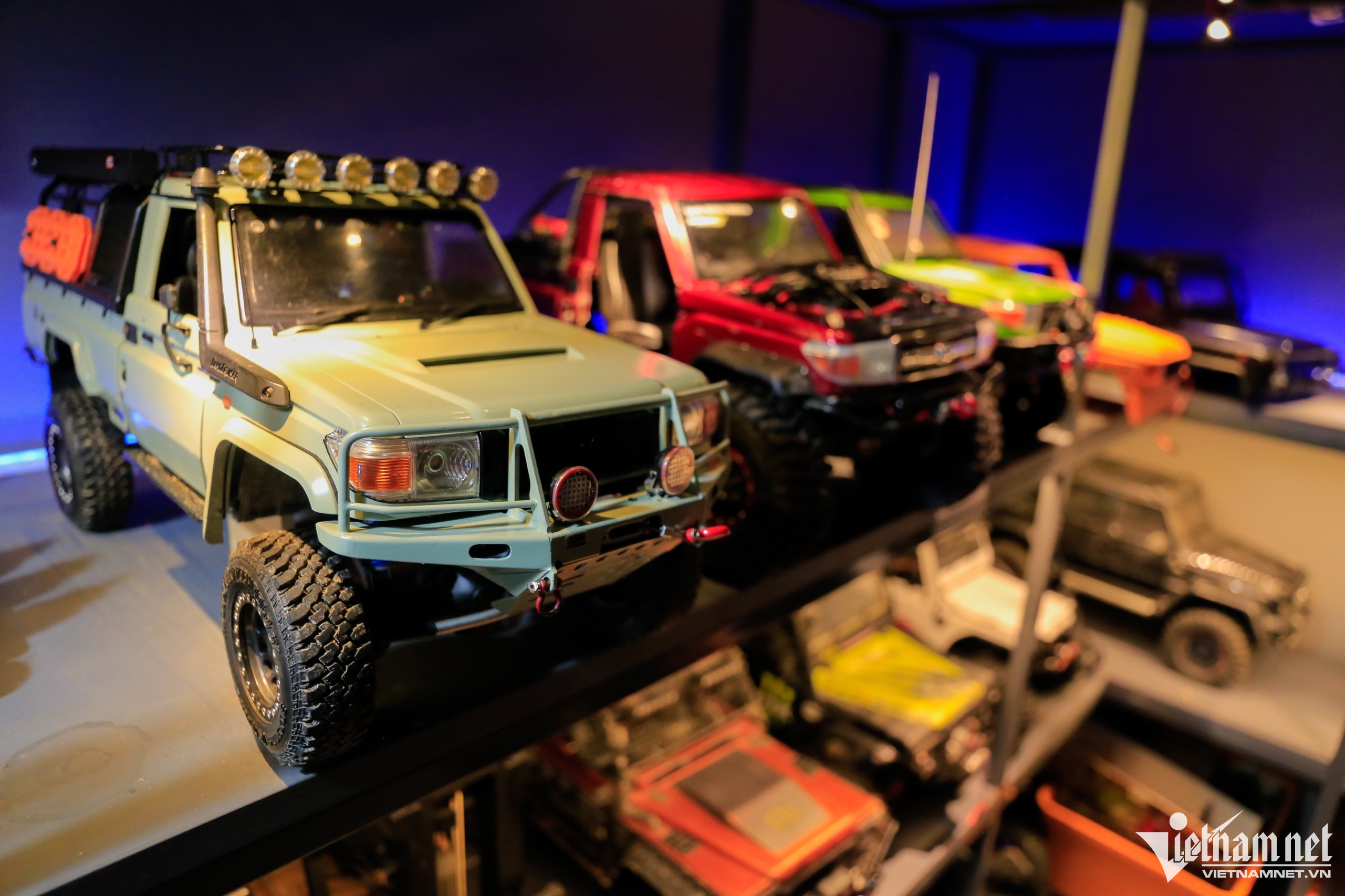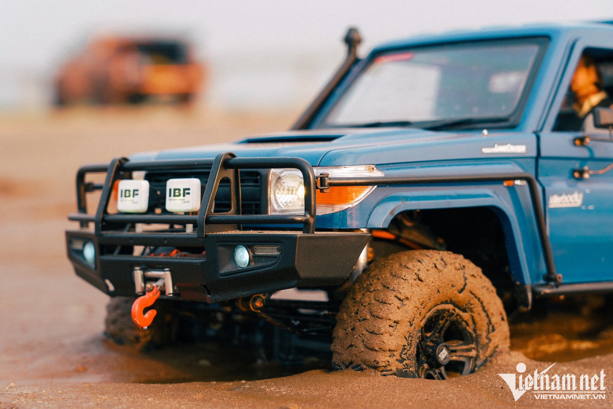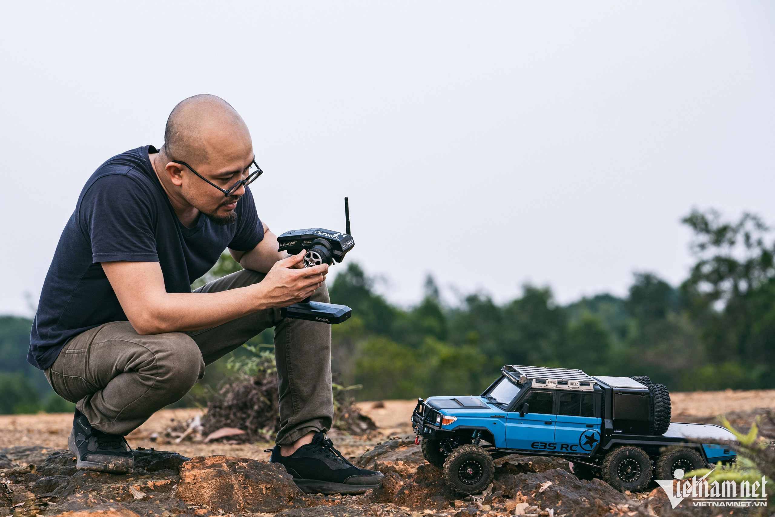 Trong ảnh là chiếc xe Land Cruiser 79 bản tỷ lệ 6x6, dòng xe nổi tiếng tại Australia. "Sau khi nhìn mô hình trên mạng xã hội, tôi khao khát có được nó và dành gần 2 năm để chuẩn bị linh kiện. Tôi nhờ các thành viên trong câu lạc bộ sáng chế một số phụ kiện để hàn gắn thay đổi toàn bộ kết cấu. Chi phí để hoàn thiện mô hình này đã tiêu tốn gần 50 triệu đồng", anh chia sẻ. Chiếc Toyota Landcuiser FJ45 được lược bỏ một số chi tiết thừa, nâng cấp bánh to và phình hơn. Khi đi vào địa hình hiểm trở có sỏi đá, bùn lầy xe sẽ thích nghi tốt. Những chiếc xe còn nguyên vết bẩn, không rửa mới thấy đúng chất "dân chơi off-road". Chạy trên địa hình bằng phẳng, nó có thể đạt vận tốc đến 150km/h, ngoài ra còn biểu diễn được một số kỹ thuật như drift, cua gắt.Để điều khiển một chiếc xe thành thạo theo ý của mình, người chơi phải rèn luyện khoảng 6 tháng đến một năm. Vị chủ nhân những chiếc ôtô này cho rằng anh phải giống như một tài xế lái xe thật, biết điều tiết ga và nắm rõ sự chuyển động của bánh xe.