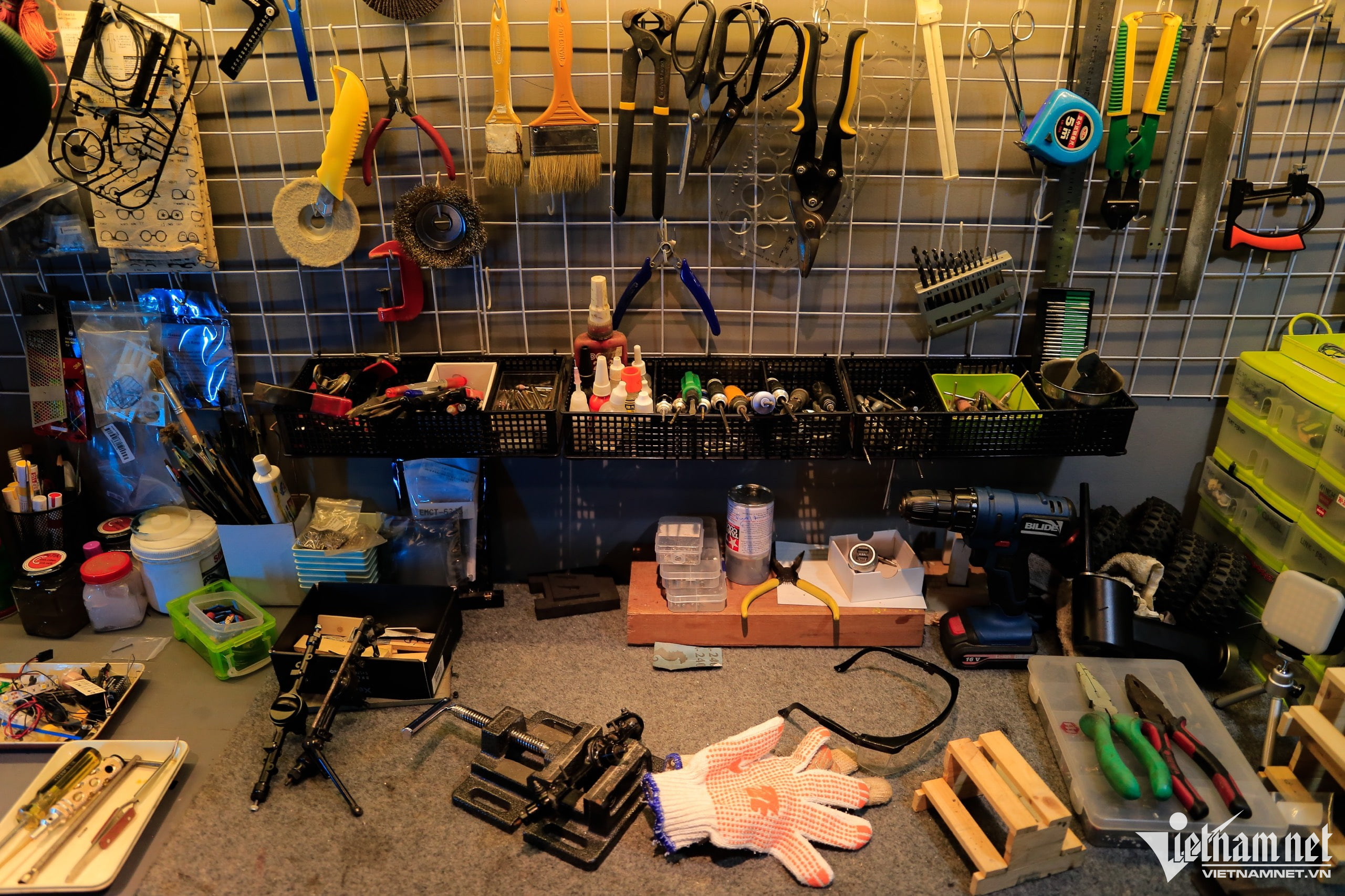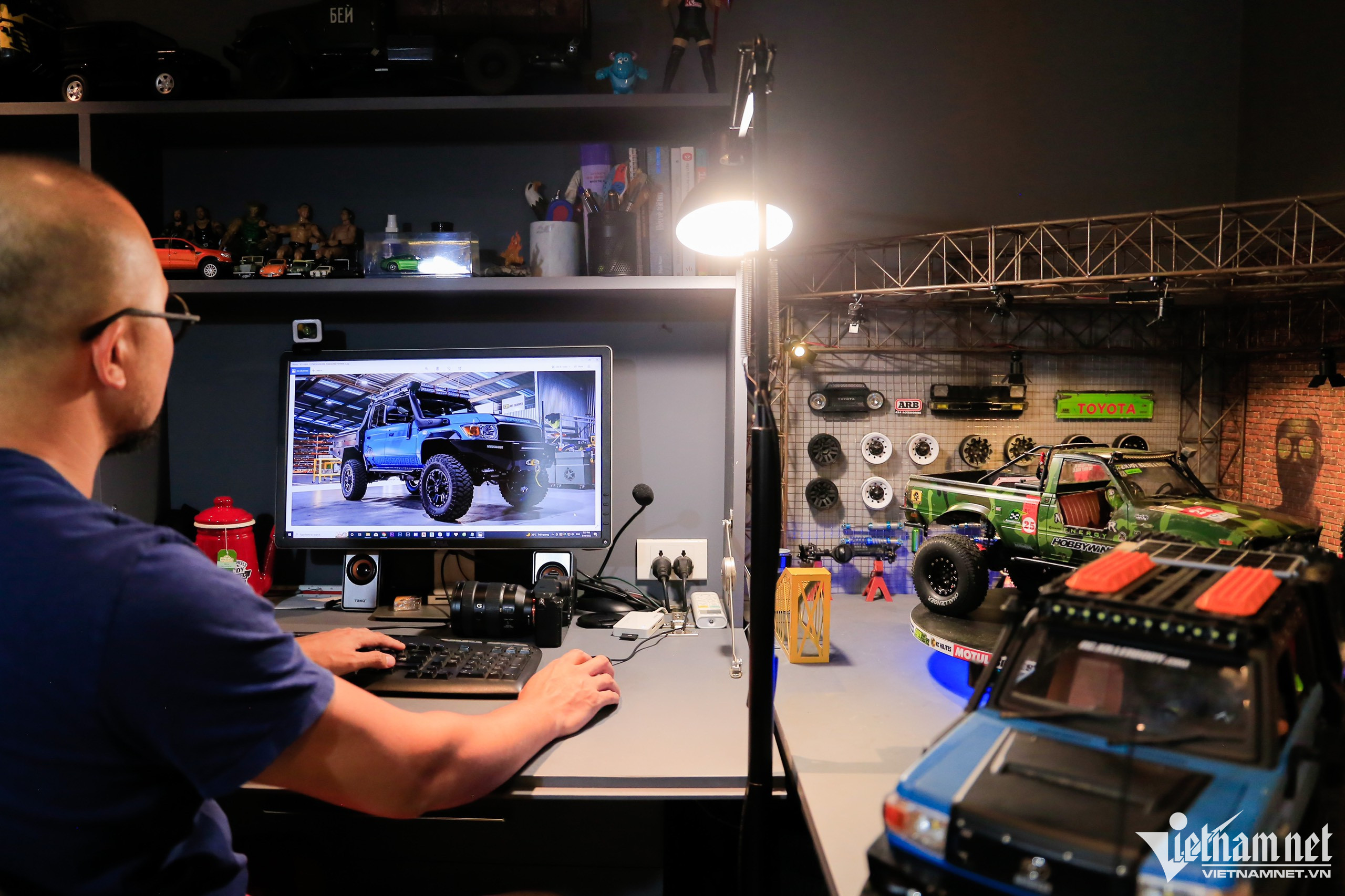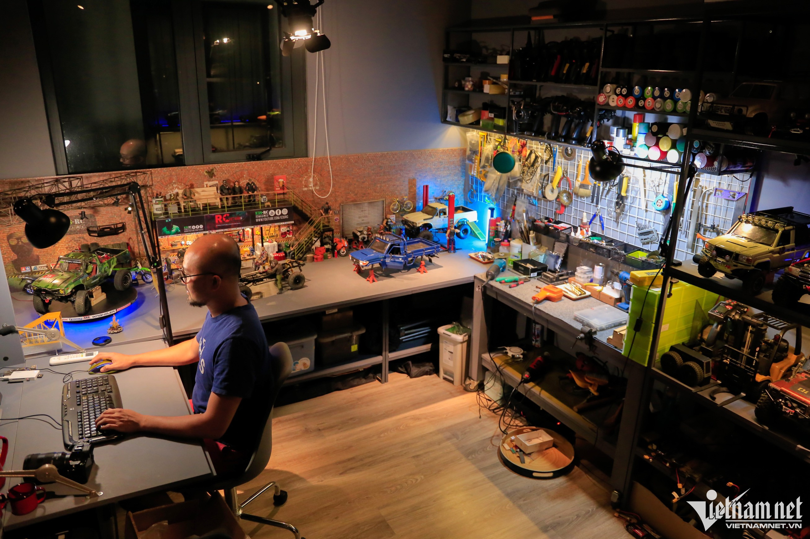 Anh Lam Kiên (quận Long Biên, Hà Nội) là một nhà thiết kế nội thất. Thông qua các trang mạng xã hội, video từ nước ngoài, gần 7 năm qua anh bắt đầu tìm hiểu về thú chơi ôtô điều khiển, đến nay anh sở hữu hơn 15 chiếc xe mô hình nhập từ các nước Mỹ, Hong Kong, Trung Quốc.Giá từ 10 - 15 triệu đồng/chiếc, có hai dòng chính anh hay lựa chọn đó là on-road và off-road. Xe on-road là loại gầm thấp, đi trên địa hình phẳng, xe off-road gầm cao, dùng để đi chuyển trên địa hình gồ ghề.Những mẫu xe Kiên sở hữu có hình dáng đơn giản, phù hợp đường trường. Do ưa thích sự hầm hố, cá tính, anh đã tháo và lắp ráp thêm một số bộ phận như khung, bánh xe và động cơ để nó có thể di chuyển qua các địa hình gồ ghề. "Xe chạy khỏe thôi chưa đủ, tôi còn phải trang trí thêm để thể hiện cá tính, có chất riêng", anh Kiên chia sẻ.Trên bàn làm việc của anh có nhiều loại đồ nghề để sửa chữa, thay thế linh kiện. "Tôi cũng phải tiếp thu, học hỏi kỹ thuật từ những người trong câu lạc bộ mới làm thành công cho đồ chơi của mình. Ví dụ như phần cản trước của xe, muốn cải tạo thì phải có kỹ năng hàn, mài dũa làm sao để nó hoạt động tốt mà lại đảm bảo an toàn", anh nói thêm.