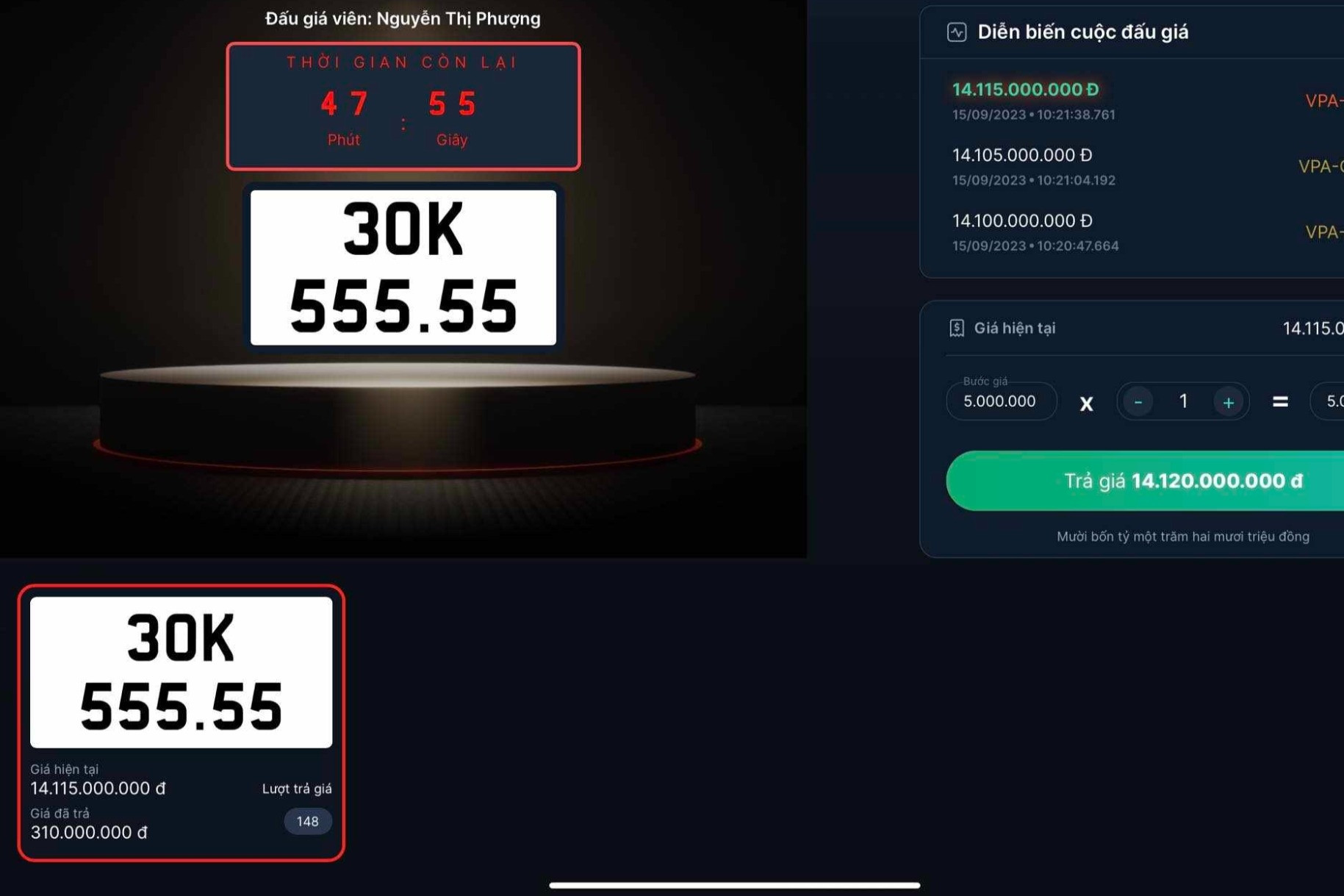 Cụ thể, trong khung đấu giá 14h45-15h45 đã tiến hành đấu biển số 51K-888.88 và khung giờ 16h-17h đấu giá biển số 30K-567.89, anh Hà Xuân Hải (Thanh Hoá) đã vượt qua 173 cá nhân tham gia đấu giá để chiến thắng với số tiền trả cao nhất. Biển "ngũ quý 8" 51K-888.88 được anh trả ở mức 32,34 tỷ đồng và biển số "sảnh rồng" 30K-567.89 có giá 13,075 tỷ đồng.