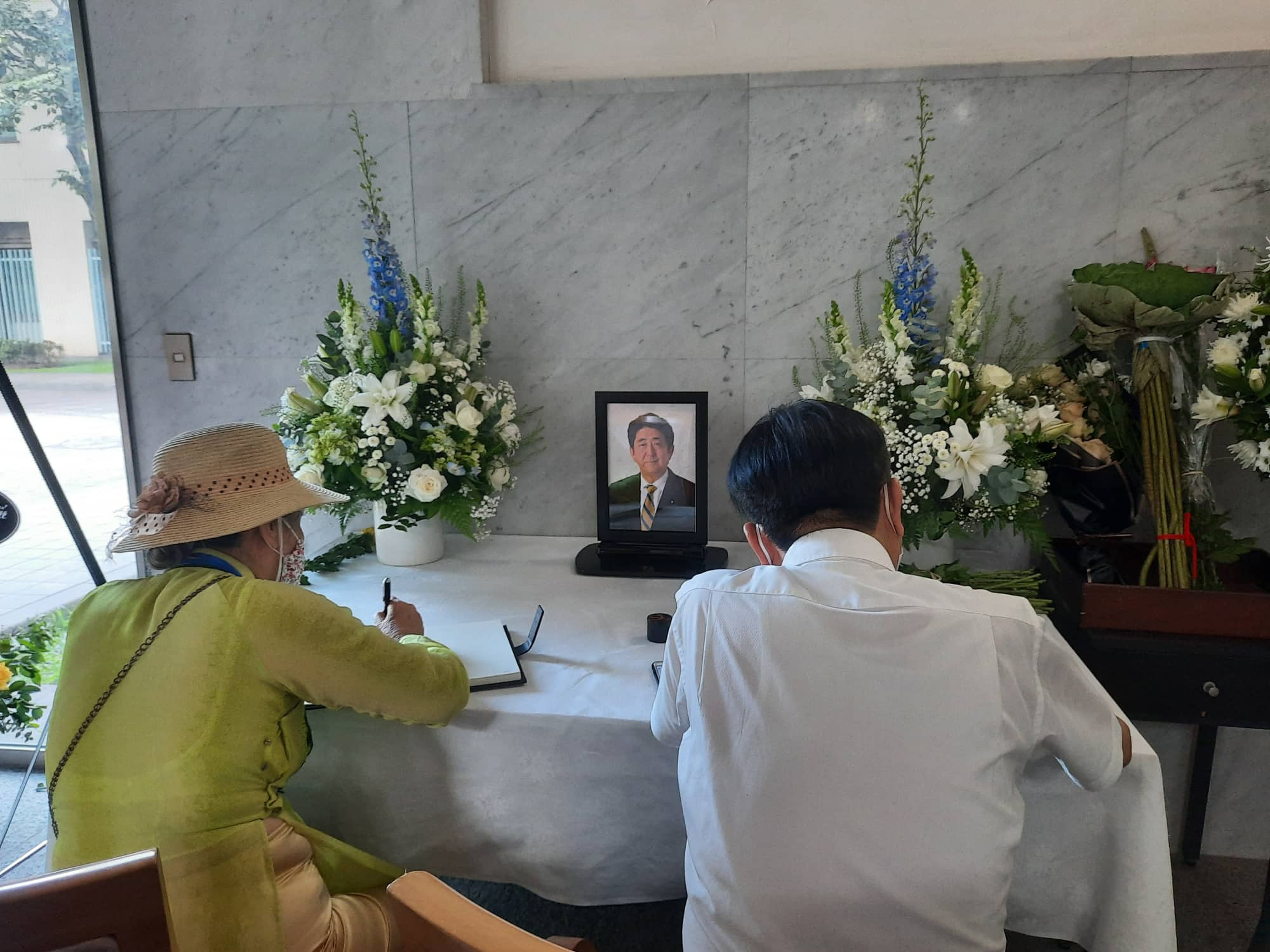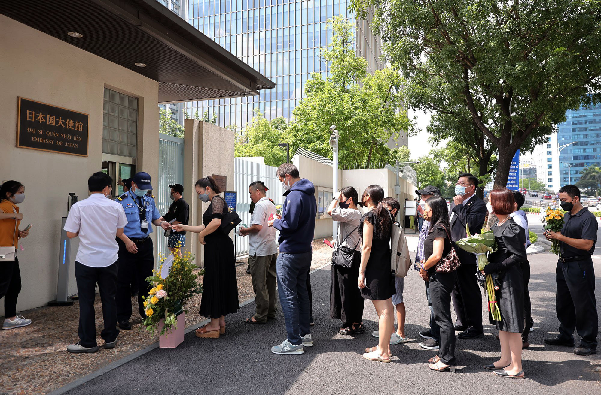 Mặc dù 9h Đại sứ quán mới mở cửa để đón tiếp người dân đến tưởng niệm, nhưng ngay từ 8h người đã xếp hàng chờ vào viếng. Dù trời nắng oi nhưng không ai rời khỏi vị trí, tất cả đều đứng trang nghiêm, lặng lẽ chờ đến lượt. Một chiếc bàn nhỏ với di ảnh cố Thủ tướng Abe được dựng lên trong khuôn viên Đại sứ quán.