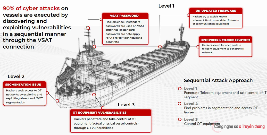 Cụ thể, 90% các vụ tấn công mạng vào tàu biển được thực hiện bởi khai thác lỗ hổng thông qua kết nối hệ thống liên lạc vệ tinh - VSAT.