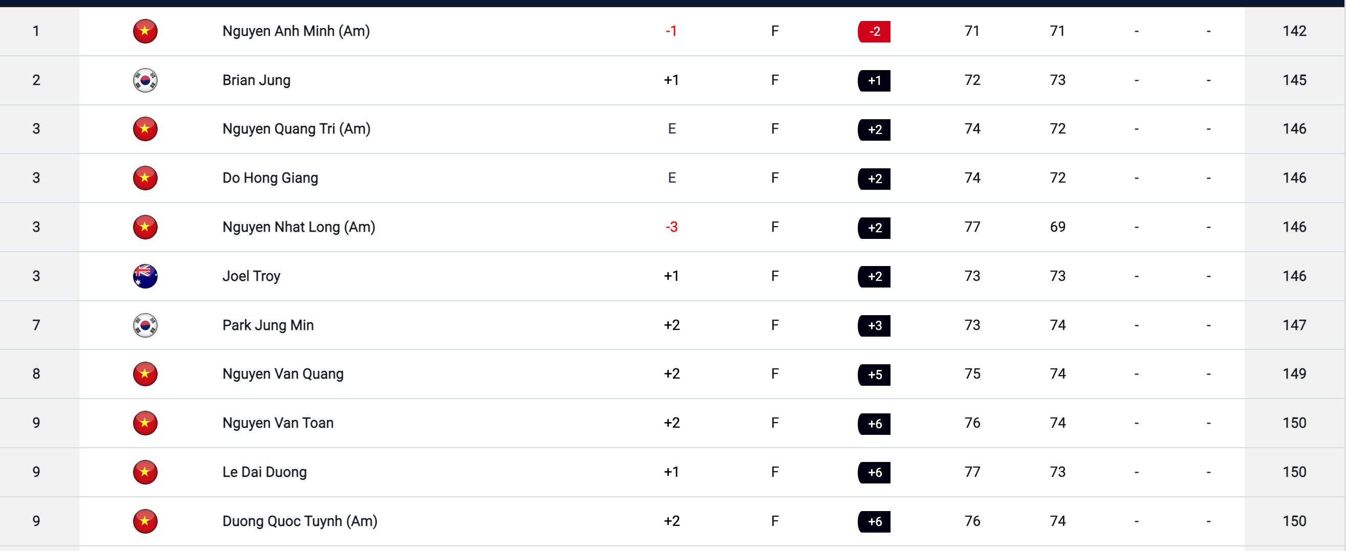 Ở 3 hố còn lại, Anh Minh ghi 2 điểm birdie để kết thúc ngày thi đấu thứ 2 với -1 gậy. Như vậy, sau 2 vòng đấu, Anh Minh đang có điểm -2, dẫn đầu BXH.