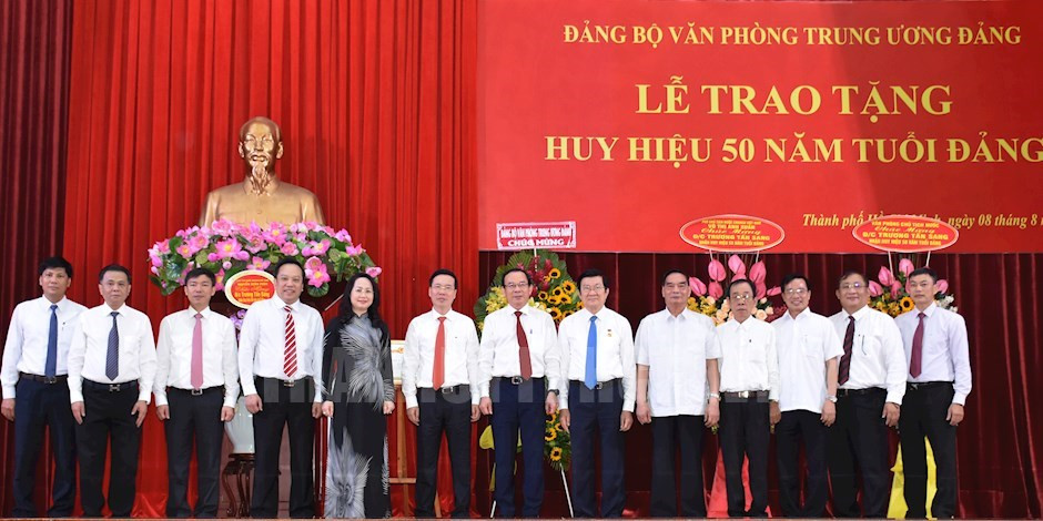 Theo đồng chí Võ Văn Thưởng, Huy hiệu 50 năm tuổi Đảng mà đồng chí Trương Tấn Sang được đón nhận, là niềm vinh dự, tự hào của đồng chí và gia đình, cũng là niềm vui, niềm tự hào của Đảng bộ Văn phòng Trung ương và các đảng bộ, chi bộ nơi đồng chí đã từng công tác.