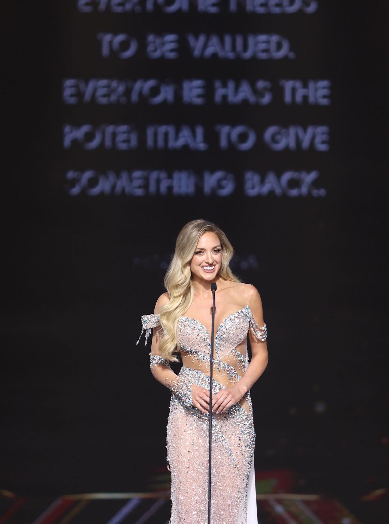 Ở phần thi dạ hội, Như Vân chọn thiết kế của Đỗ Long được kết tinh từ những viên pha lê vàng óng, lấy cảm hứng từ hình ảnh bông lúa trĩu hạt trên những cánh đồng bao la của Việt Nam.
