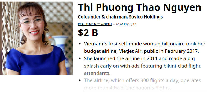 Năm 2017 Việt Nam có 2 tỷ phú USD được ghi danh toàn cầu là ông Phạm Nhật Vượng và bà Nguyễn Thị Phương Thảo, theo bảng xếp hạng của Forbes.