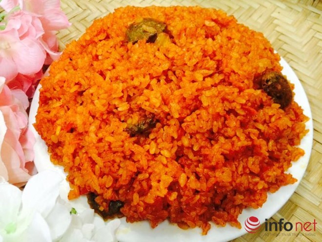 Xôi gấc có màu đỏ rất đẹp mắt, vị ngọt thanh nhẹ lại béo ngậy của dầu mè ngấm trong từng hạt nếp dẻo rất được ưa chuộng trong các dịp lễ Tết.