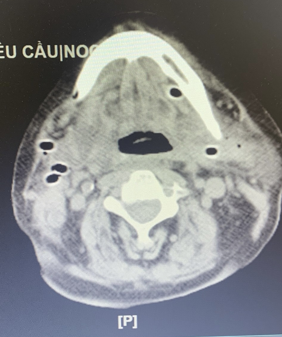 Thời điểm nhập Bệnh viện Việt Đức, ông T. khó thở nhiều, vết mổ chảy nhiều dịch mủ hôi. Người bệnh được làm xét nghiệm chụp cắt lớp với chẩn đoán bệnh viêm tấy sàn miệng lan tỏa do răng và phải mổ cấp cứu.