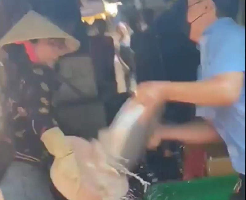 Tuy nhiên, khi nhân viên quay lại thì tiểu thương này vẫn chưa dọn theo yêu cầu, hai bên sau đó xảy ra cự cãi với nhau. Quá trình này tiểu thương đã hắt chậu cá vào các nhân viên ban quản lý; do bực tức nên một số nhân viên cũng bưng chậu cá hắt ngược lại vào người nữ tiểu thương.
