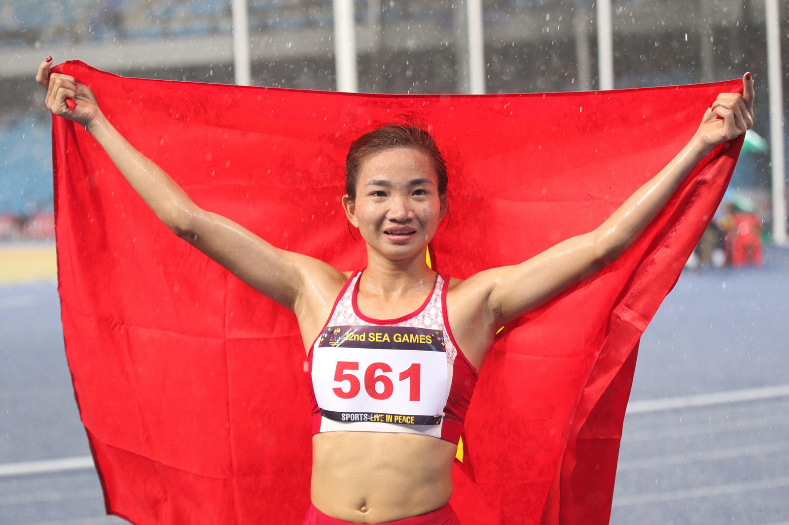 Chiều 8/5, các nội dung chung kết môn điền kinh diễn ra trên SVĐ Morodok. Nguyễn Thị Oanh trở thành tâm điểm khi tranh tài ở nội dung 5.000m.Ở những vòng đầu, Nguyễn Thị Oanh sử dụng chiến thuật núp gió đối thủ nhằm tiết kiệm sức lực. Ngoài Oanh, Việt Nam còn có Phạm Thị Hồng Lệ. Hai chân chạy của Việt Nam tranh tài cùng 9 VĐV khác đến từ các quốc gia Thái Lan, Campuchia, Singapore, Philippines, Malaysia, Indonesia, Timor Leste và Lào.Tuy nhiên ở những vòng cuối, VĐV Việt Nam một mình băng về đích, bỏ xa các đối thủ ở phía sau.Nguyễn Thị Oanh có chút thấm mệt khi về đích.Với thành tích 17 phút 00 giây 28, Nguyễn Thị Oanh bỏ xa các đối thủ còn lại để giành tấm HCV SEA Games 32 nội dung 5000m nữ.Nguyễn Thị Oanh bảo vệ tấm HCV thành công, trong khi Phạm Thị Hồng Lệ đoạt HCB. "Cô gái vàng" của thể thao Việt Nam ăn mừng chiến thắng.Chiến thắng kép của điền kinh Việt Nam lần thứ 2 liên tiếp tại đấu trường SEA Games. Ở SEA Games 31, trên sân Mỹ Đình cách đây một năm, Oanh cũng về nhất và Lệ về thứ 2.Cơn mưa to làm dịu mát bầu không khí.Nụ cười tươi của Nguyễn Thị Oanh.VĐV người Bắc Giang còn tham dự ở 2 nội dung nữa tại SEA Games là 1.500m và 3.000m vượt chướng ngại vật.