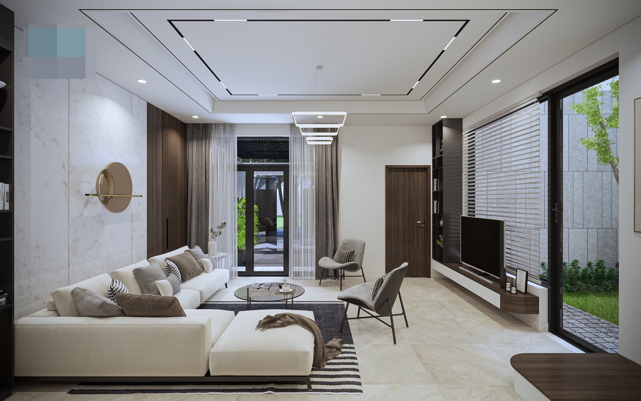 Tổng thể ngôi nhà mang màu trắng kem tinh tế, nội thất đơn giản, tiết chế chi tiết.